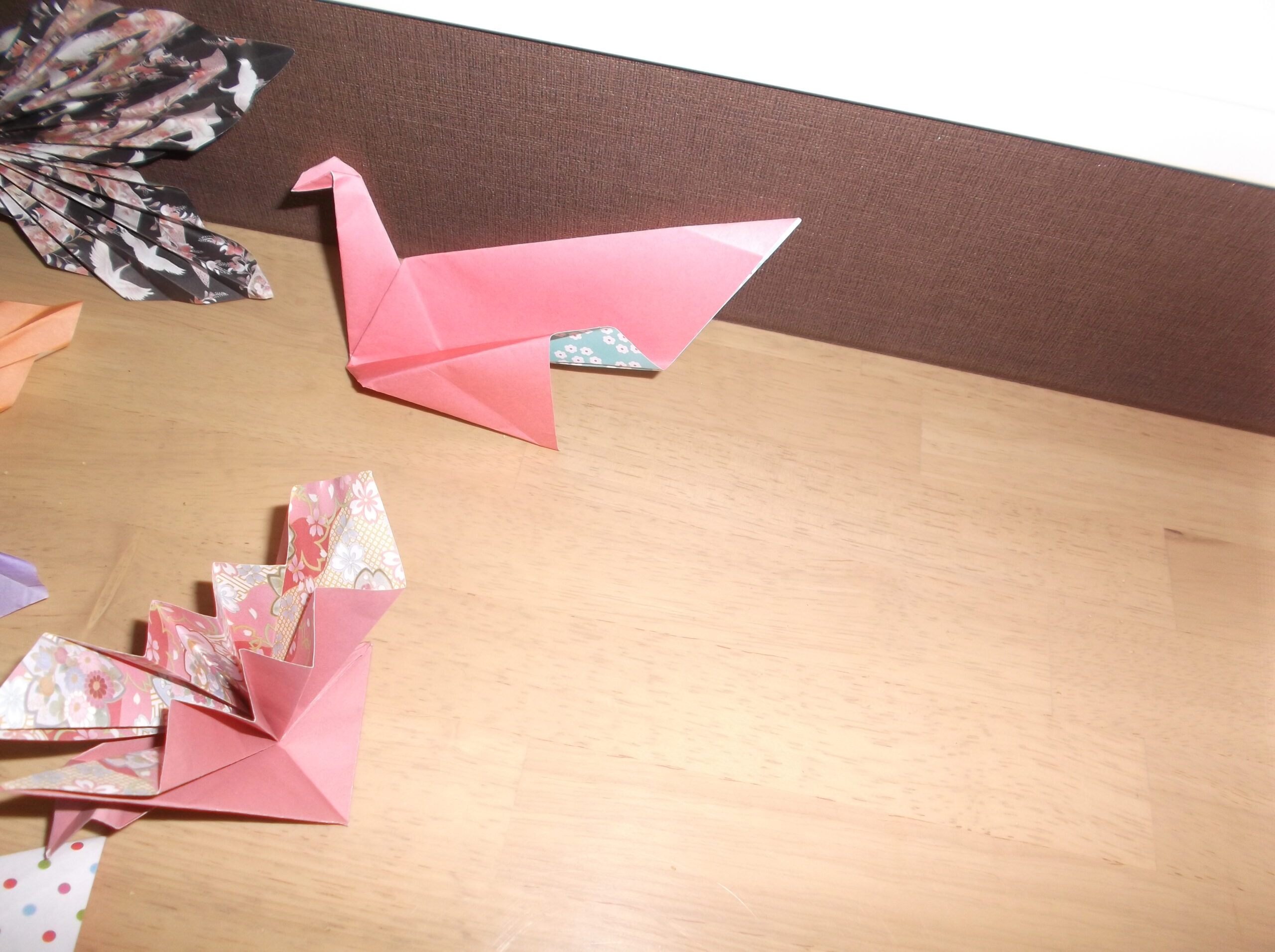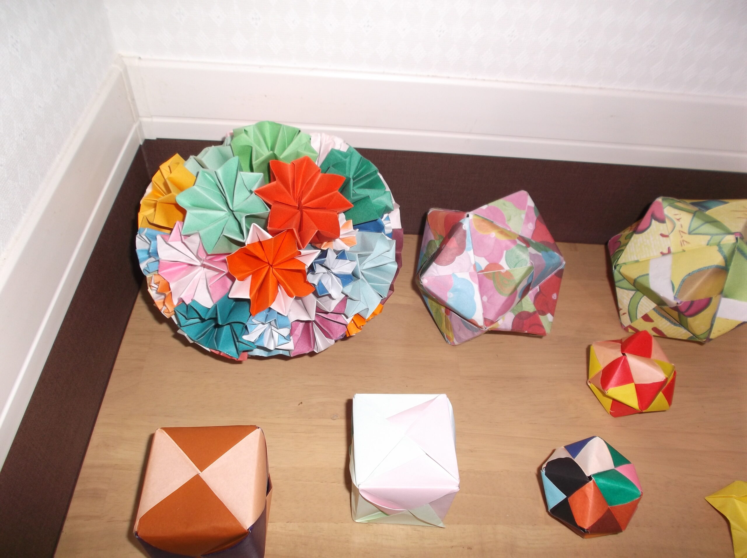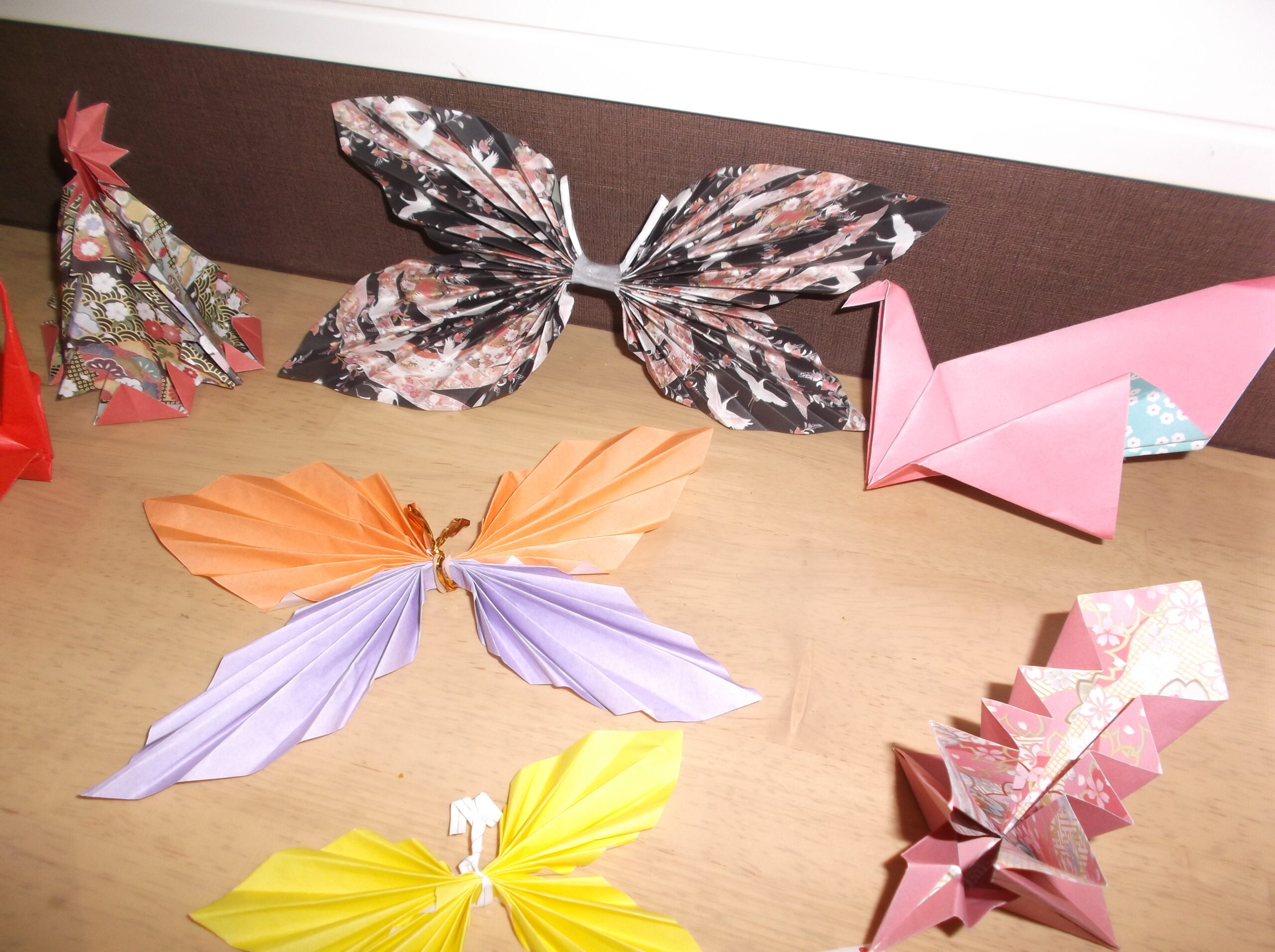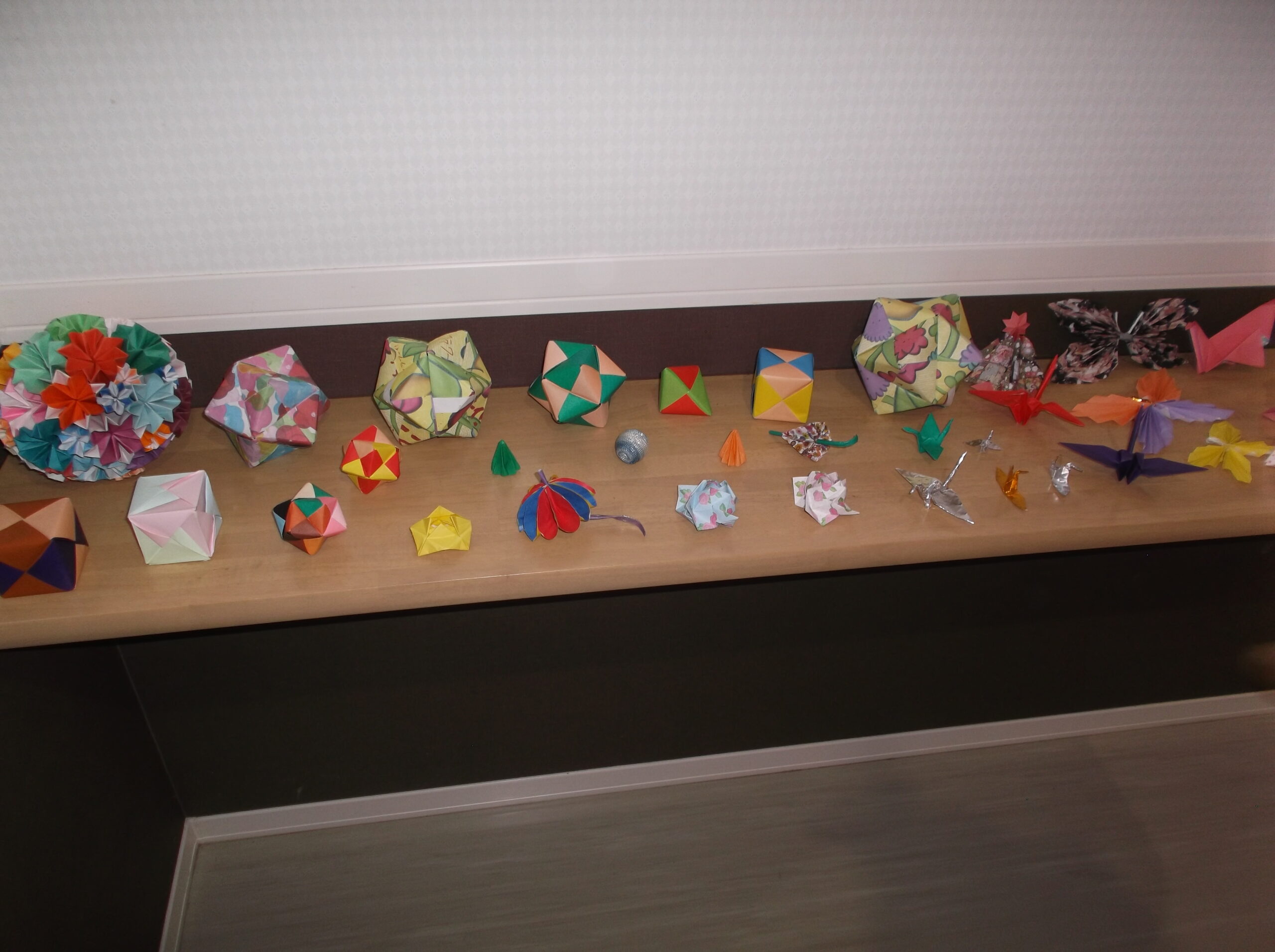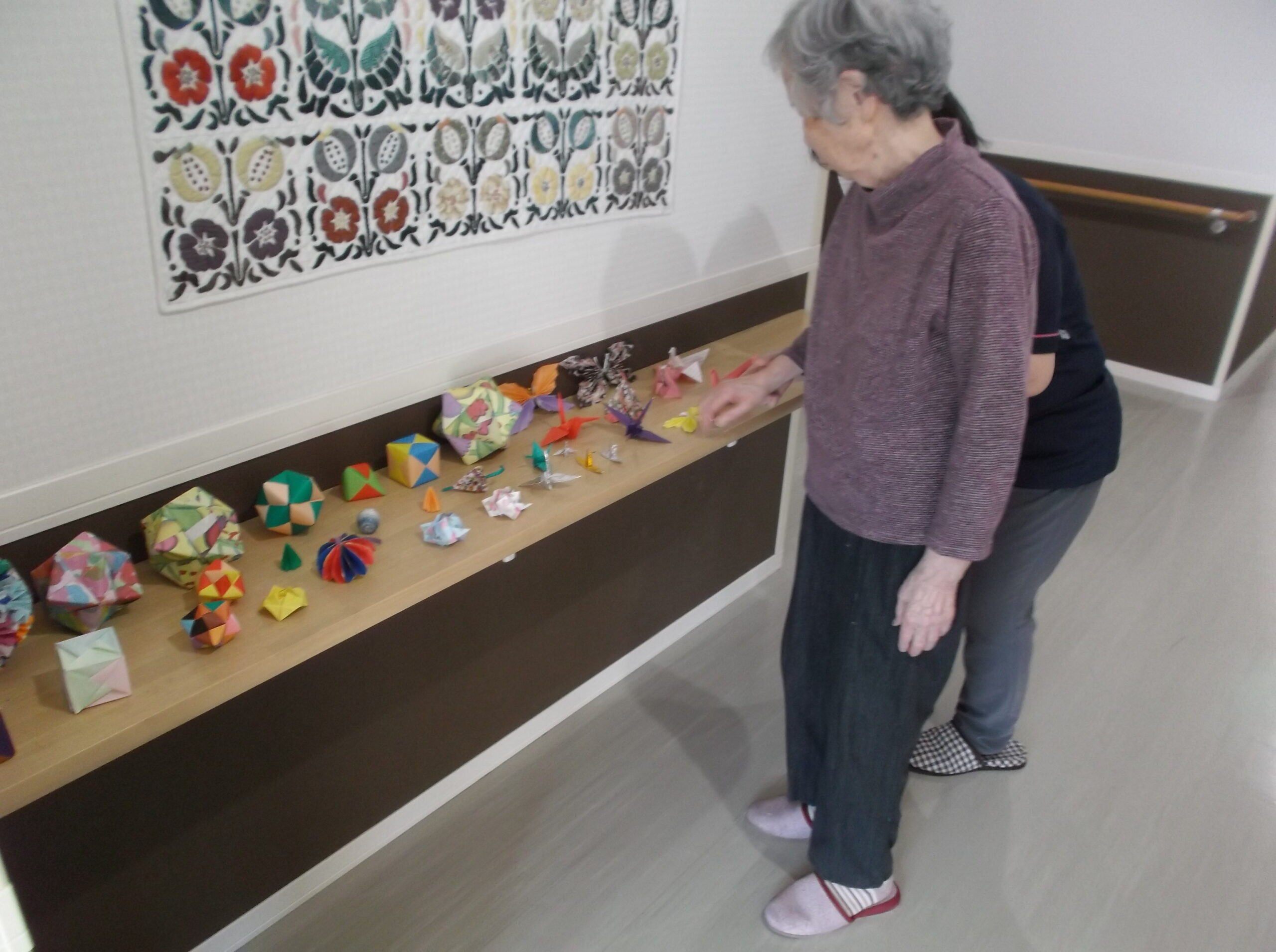 この度入居者様が半年かけて作られた折り紙作品を 廊下の飾り物用カウンタ-に公開展示されました。 丸っこい形の複雑な物、蝶々の作品、鳥の様な作品、四角い箱状の 作品等々です。全景を見るとご苦労とご努力が伝わってきます。 何と細やかで色彩豊かな可愛らしい作品でしょう。他の入居者様も感心しきりです。