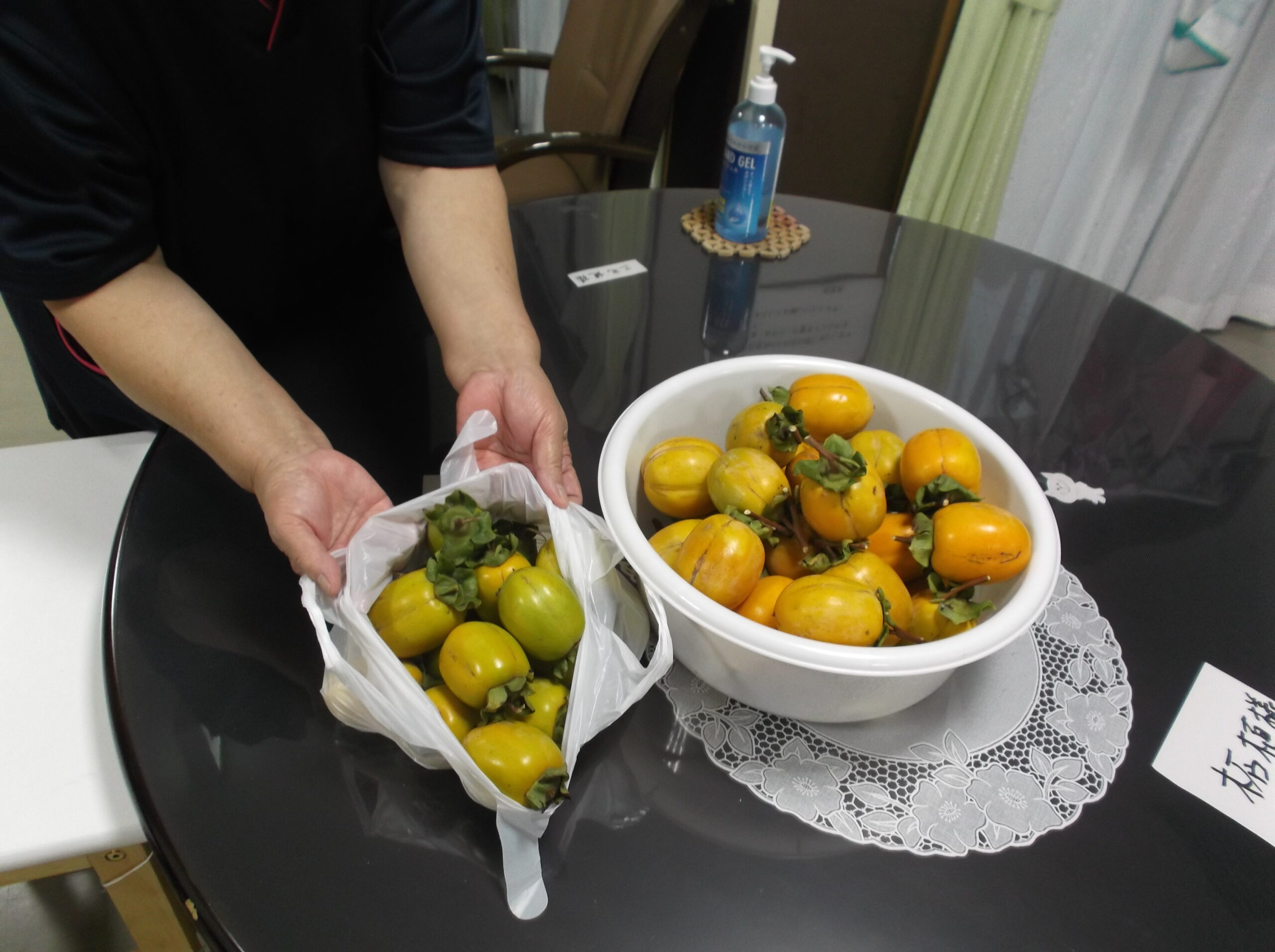 施設の大家さん宅の柿が収穫時期を迎えました。 渋柿なので毎年干し柿にしています。 たくさん取れて職員が皮をむいて干しております。 12月初めごろにはいい干し具合でしょうか? 入居者様も大変、楽しみにされております。