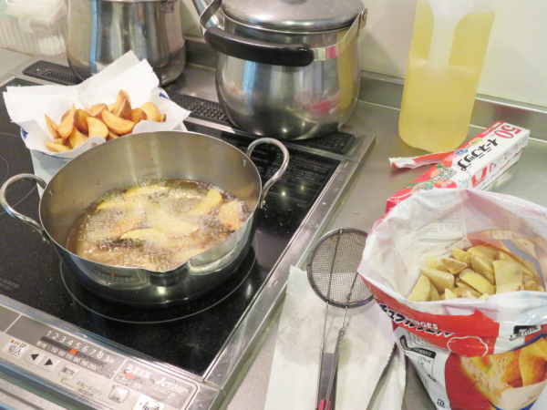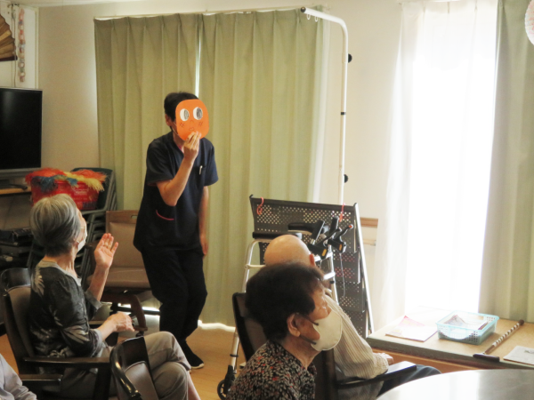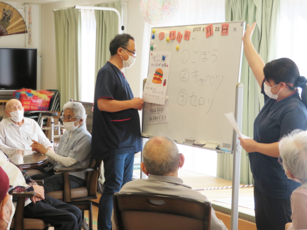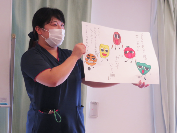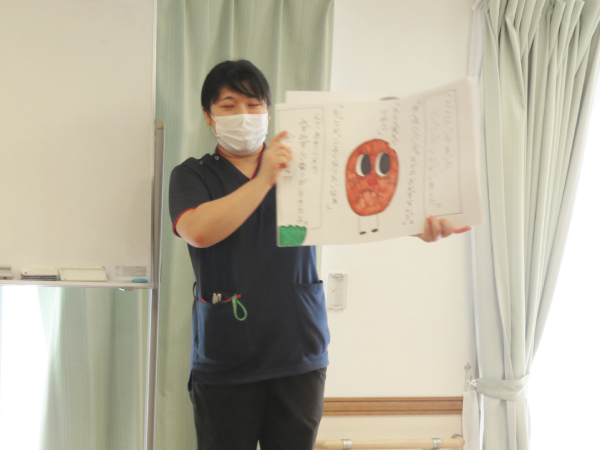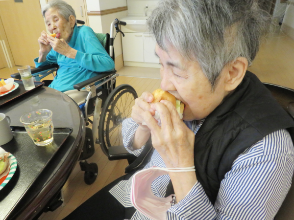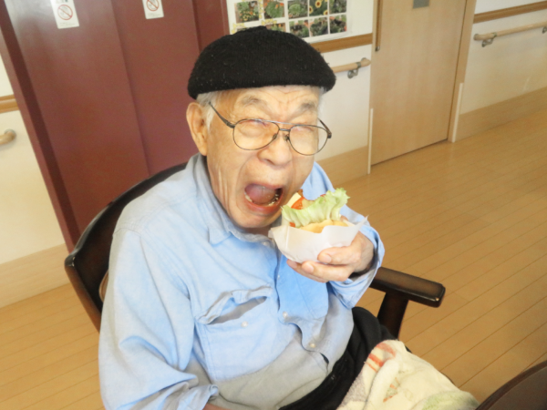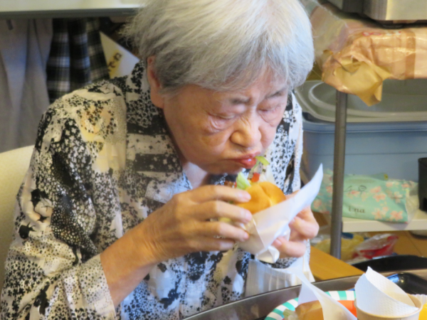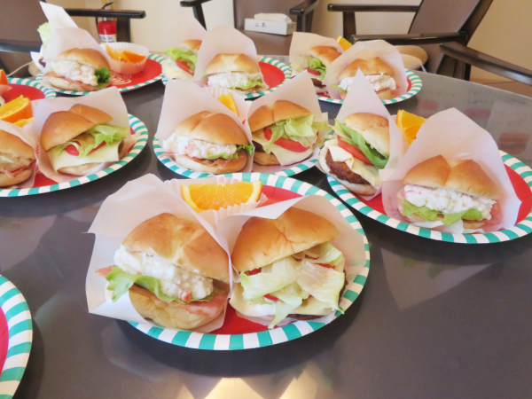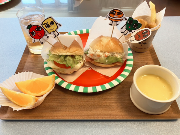 湯楽苑で喫茶イベントを行いました。 備蓄用のハンバーグを活用し、本日はハンバーガーを作りました。 ハンバーガーには、セットとしてポテトとドリンクが付きものということで、湯楽苑特製の梅ジュースの炭酸割りとオレンジを添えました。 せっかくの「ハンバーグランチ」を楽しんでいただくために、午前中にはハンバーガーにちなんだクイズを行ったり、自作の紙芝居『ぼくはハンバーグ』を披露したりして、気分を盛り上げました。 紙芝居もハンバーグランチも大好評でした。