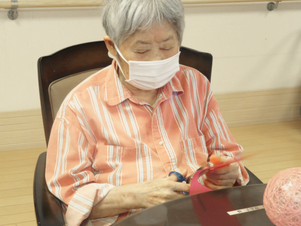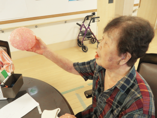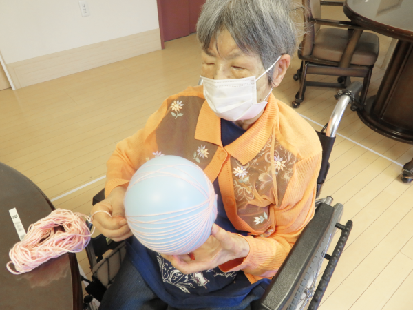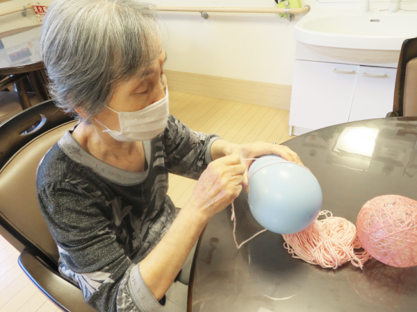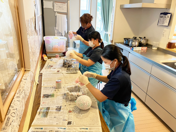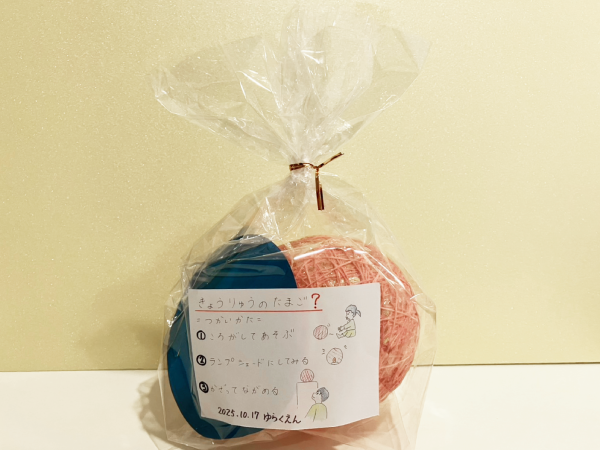 10月中旬に予定している地域の保育園との交流会に向けて、園児の皆さんにお渡しするプレゼントの準備を進めています。 今回は、コットンボールの中に鈴を入れ、かわいらしい恐竜を添えた「恐竜のたまご?」を作成しました。 転がして遊ぶのはもちろん、ランプシェードとして飾ったり、お部屋のインテリアとして楽しんだりと、さまざまな用途で楽しんでいただけます。 園児たちの喜ぶ顔を思い浮かべながら、ご利用者の皆さまと一緒に心を込めて作成しています。