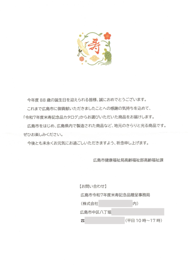 11月に米寿を迎えられるご利用者様に、広島市より敬老記念品が届きました。