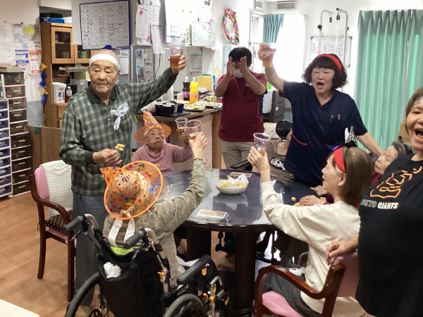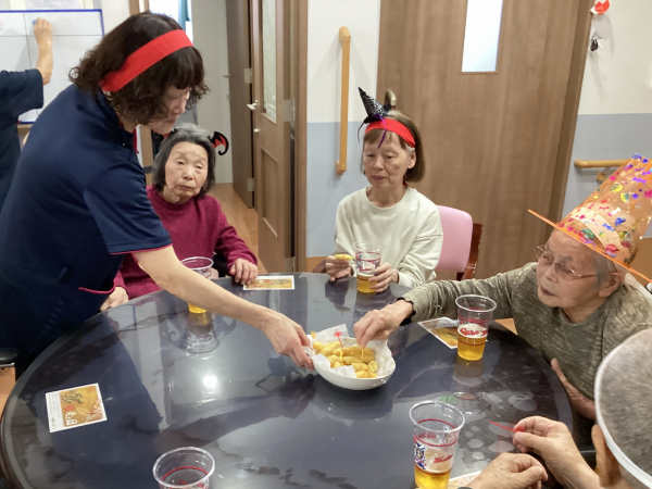 たくさん体を動かした後は、ハロウィンの仮装を楽しみながら、ノンアルコールビールやジュース、フライドポテトを味わい、笑顔あふれるおやつタイムとなりました。