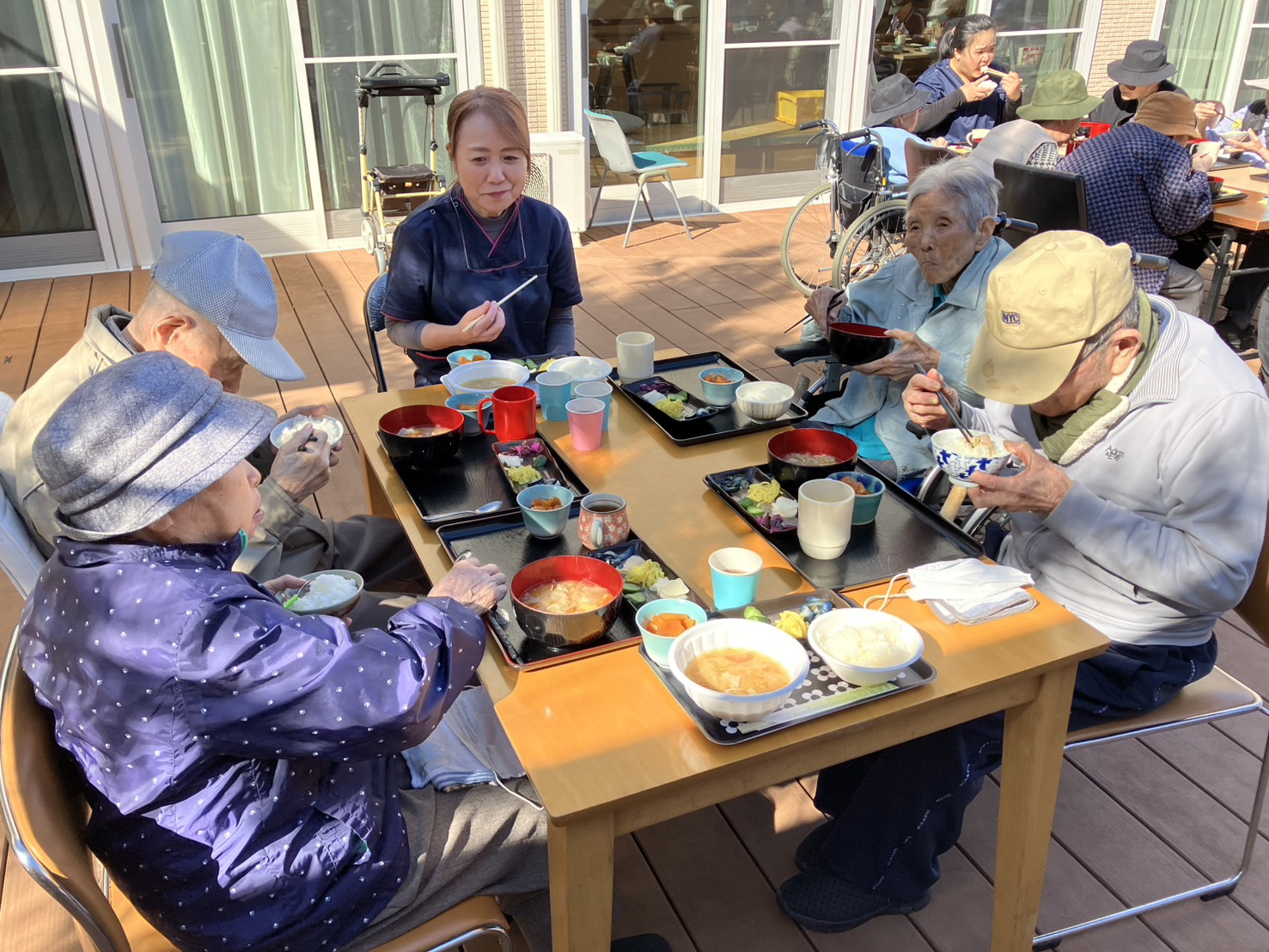 琉球国祭り太鼓の興奮冷めやらぬ中で、ウッドデッキで職員も一緒に食べました。
