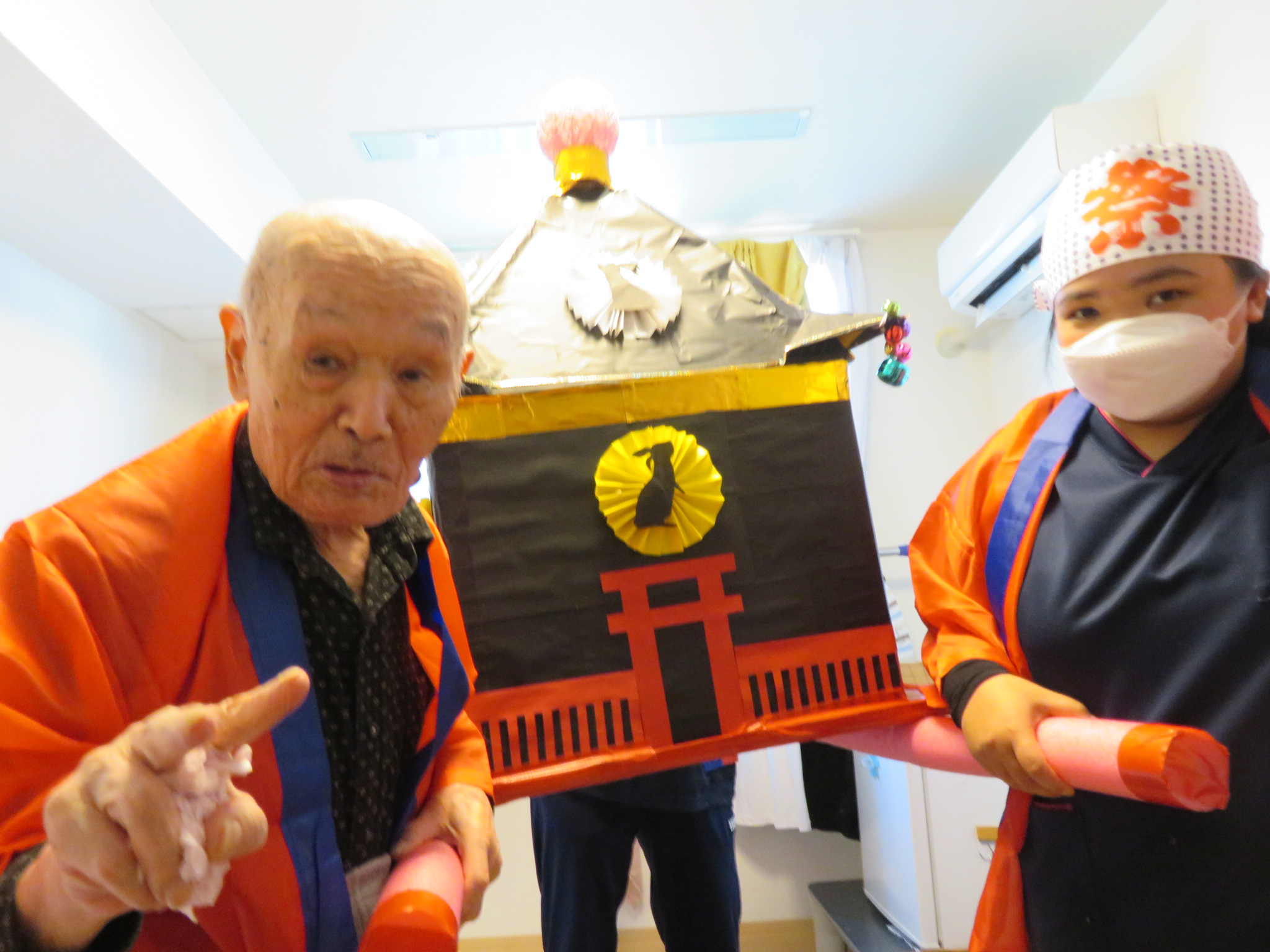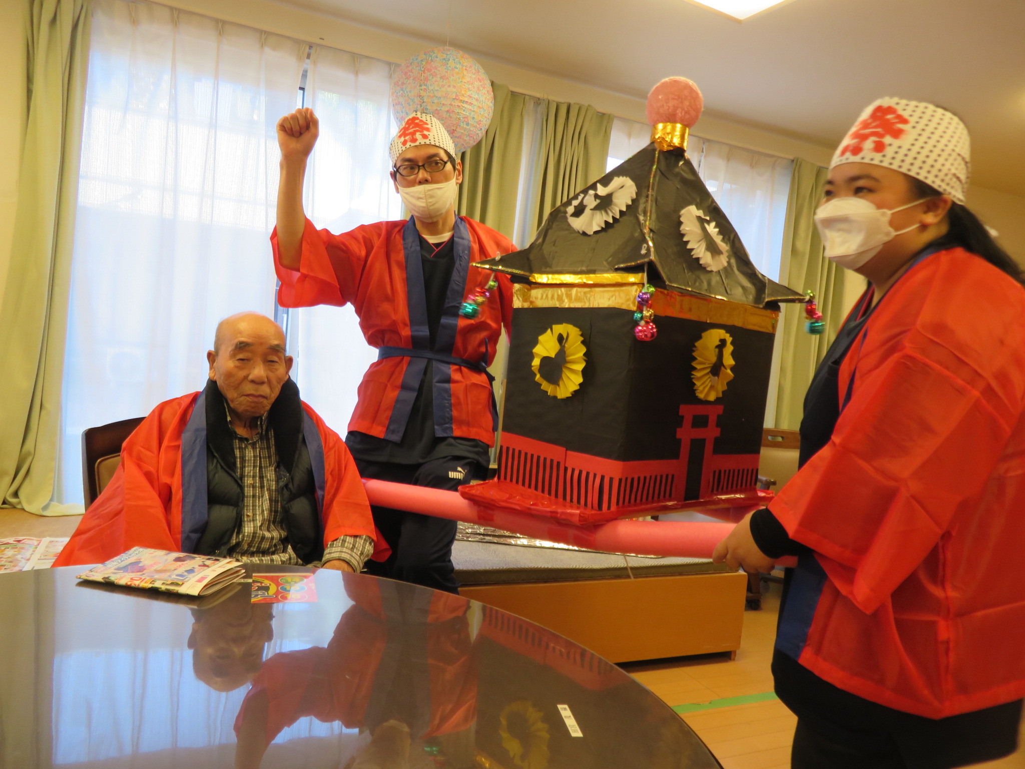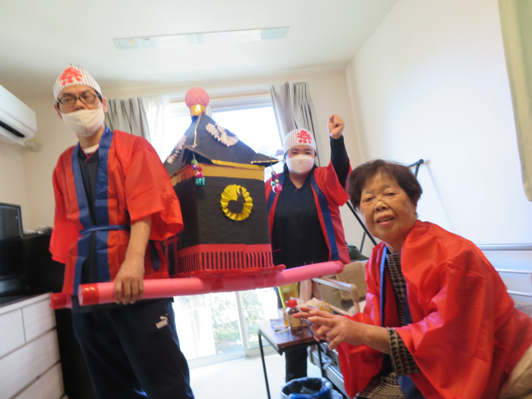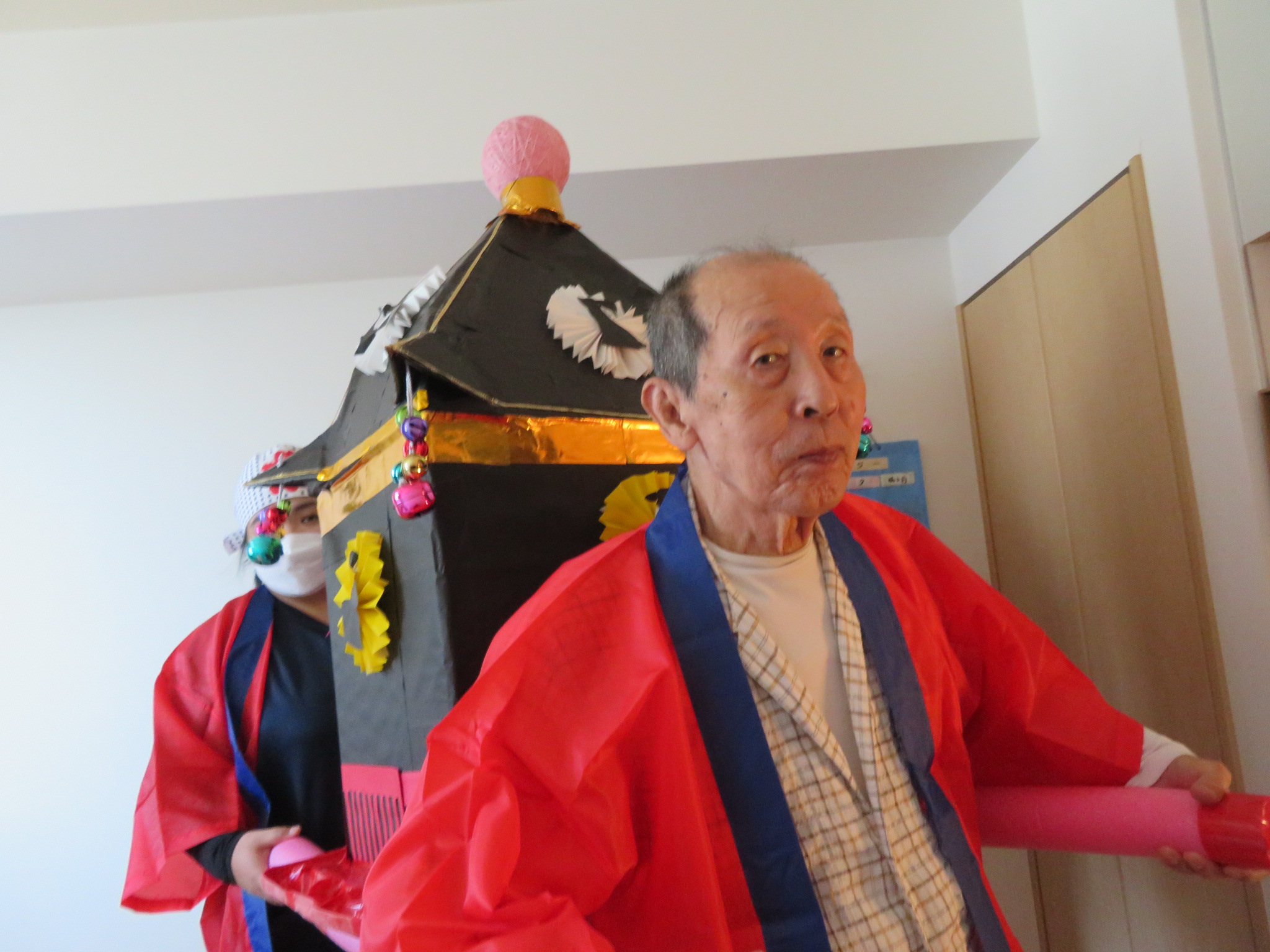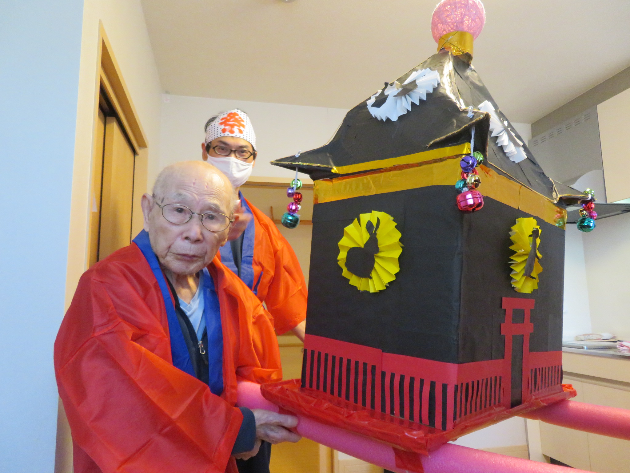 突然の音楽と掛け声に驚かれたご利用者もおられましたが、ご利用者にも法被を着て頂き、一緒に「ワッショイ・ワッショイ」と威勢の良い声と笑顔が広がりました。
