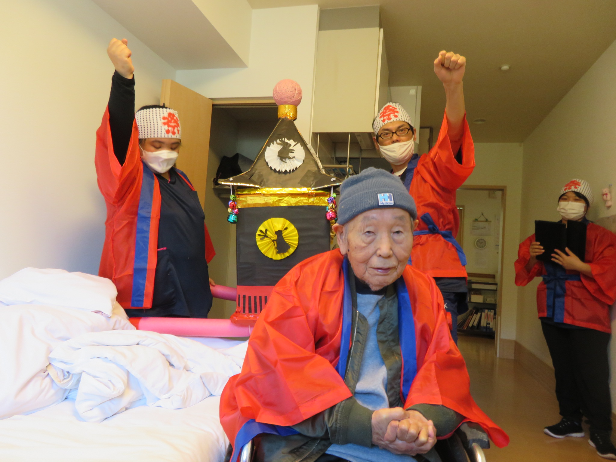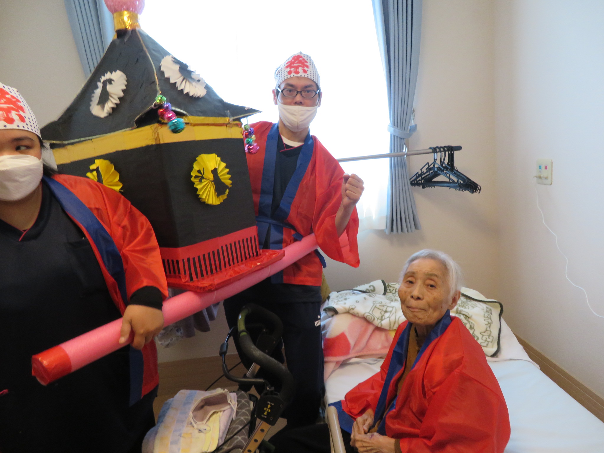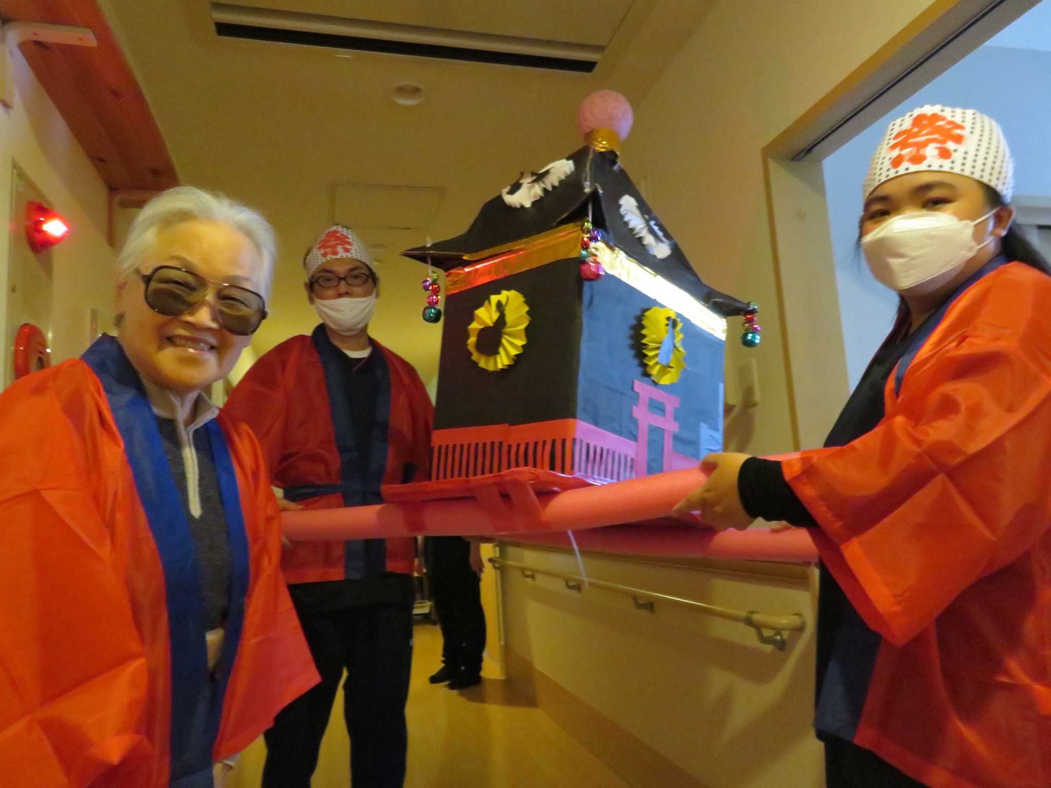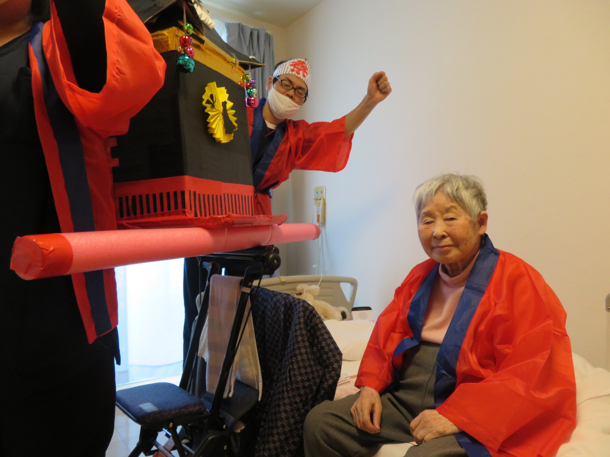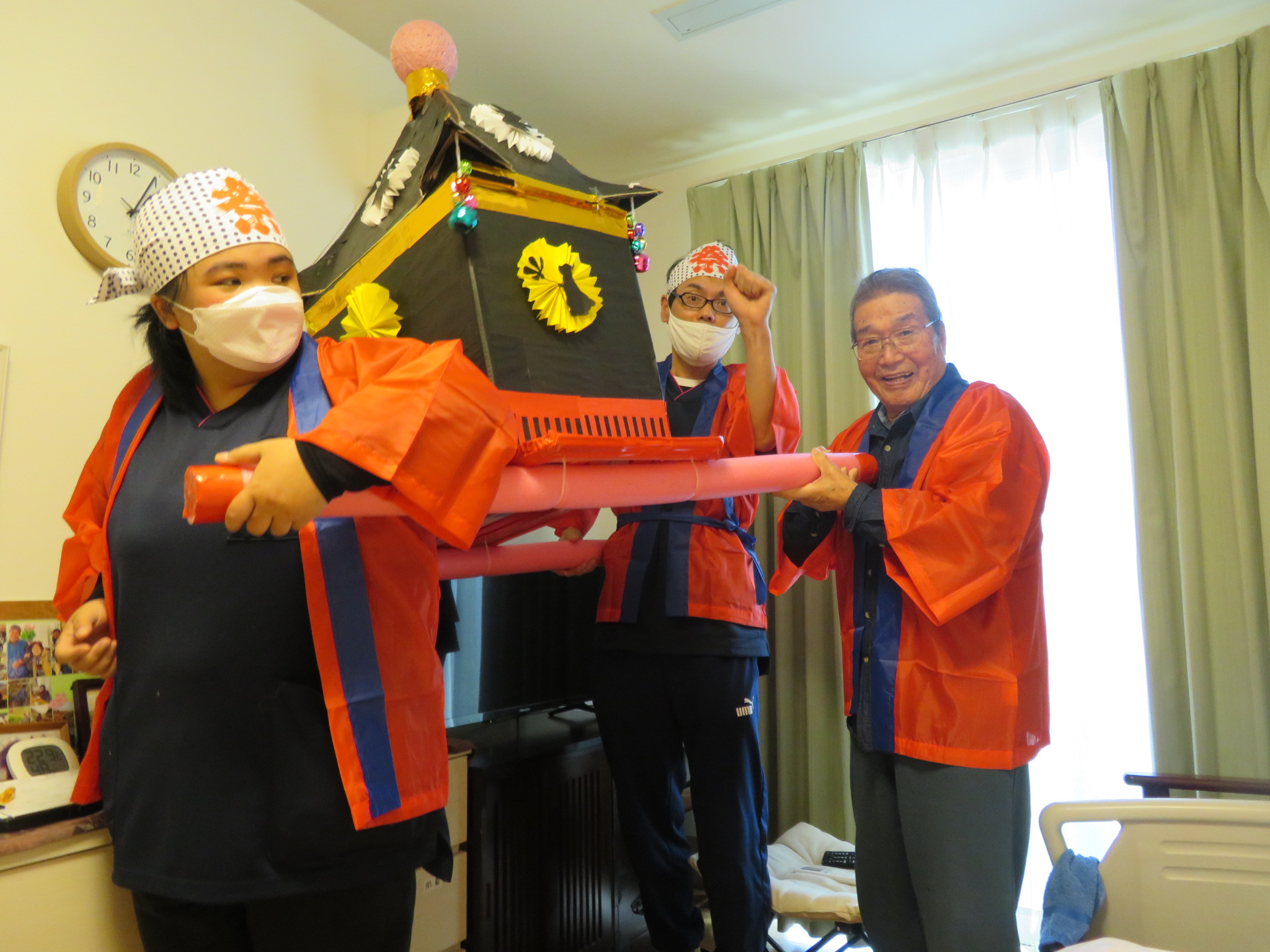 突然の音楽と掛け声に驚かれたご利用者もおられましたが、ご利用者にも法被を着て頂き、一緒に「ワッショイ・ワッショイ」と威勢の良い声と笑顔が広がりました。