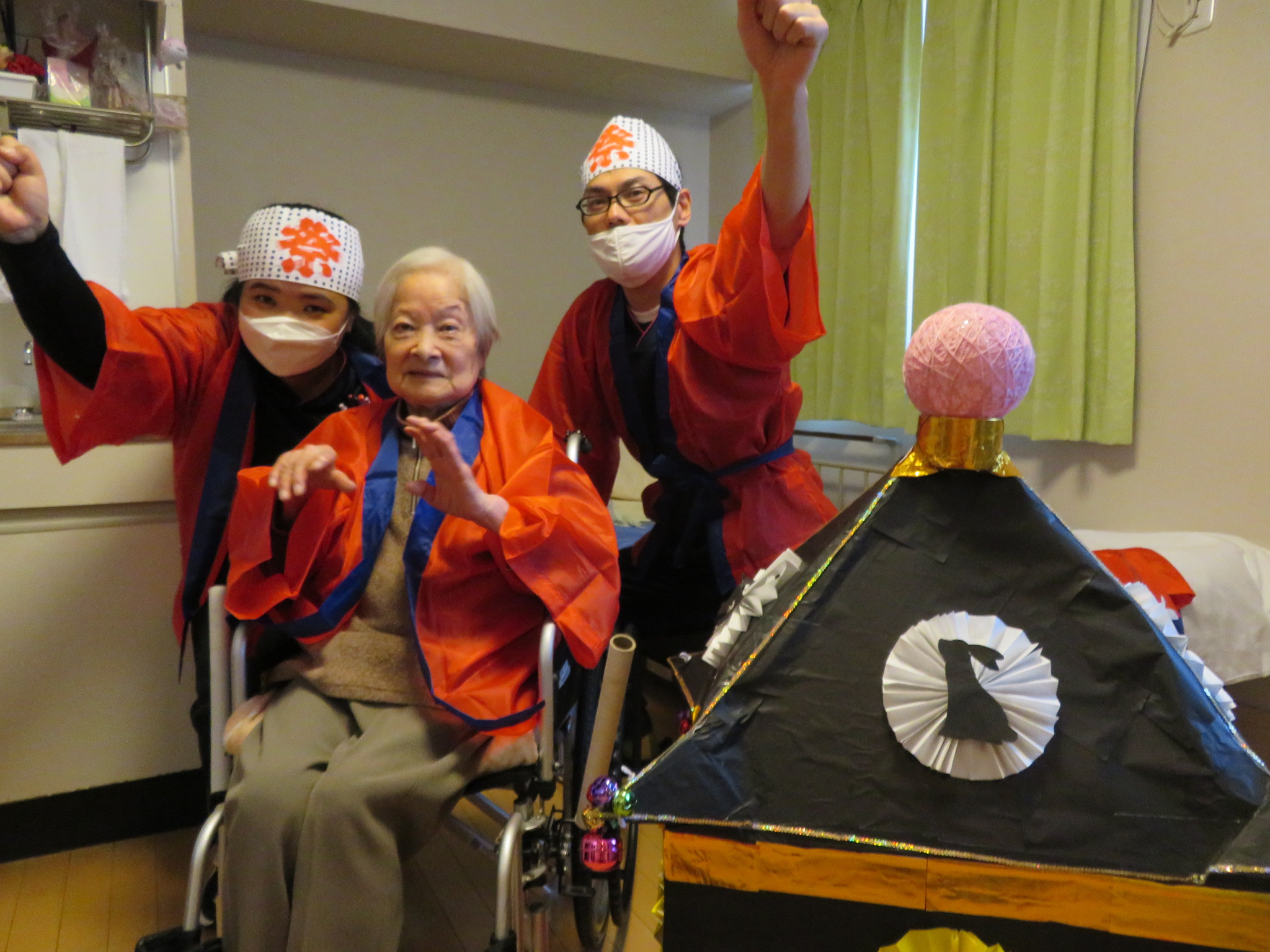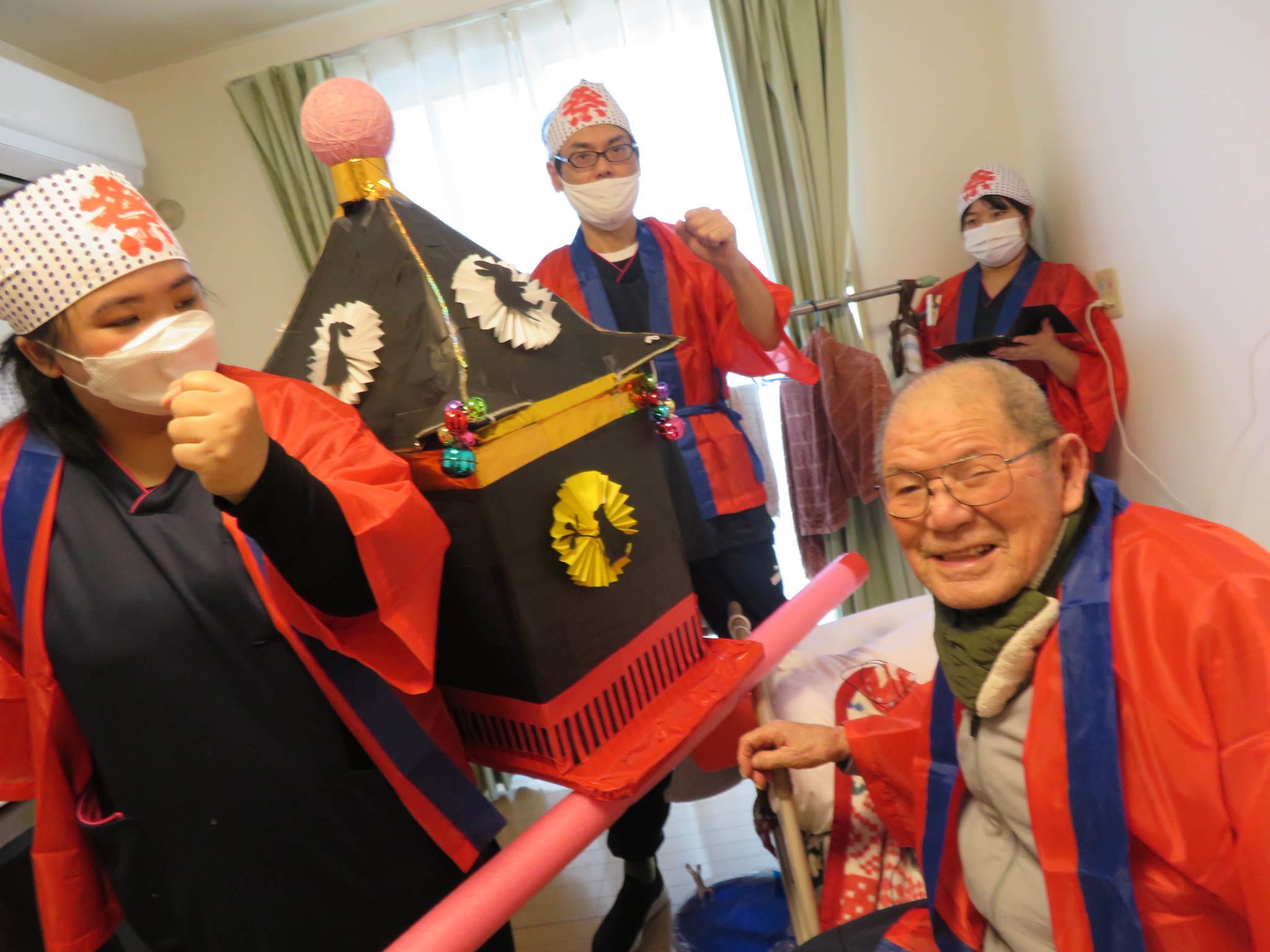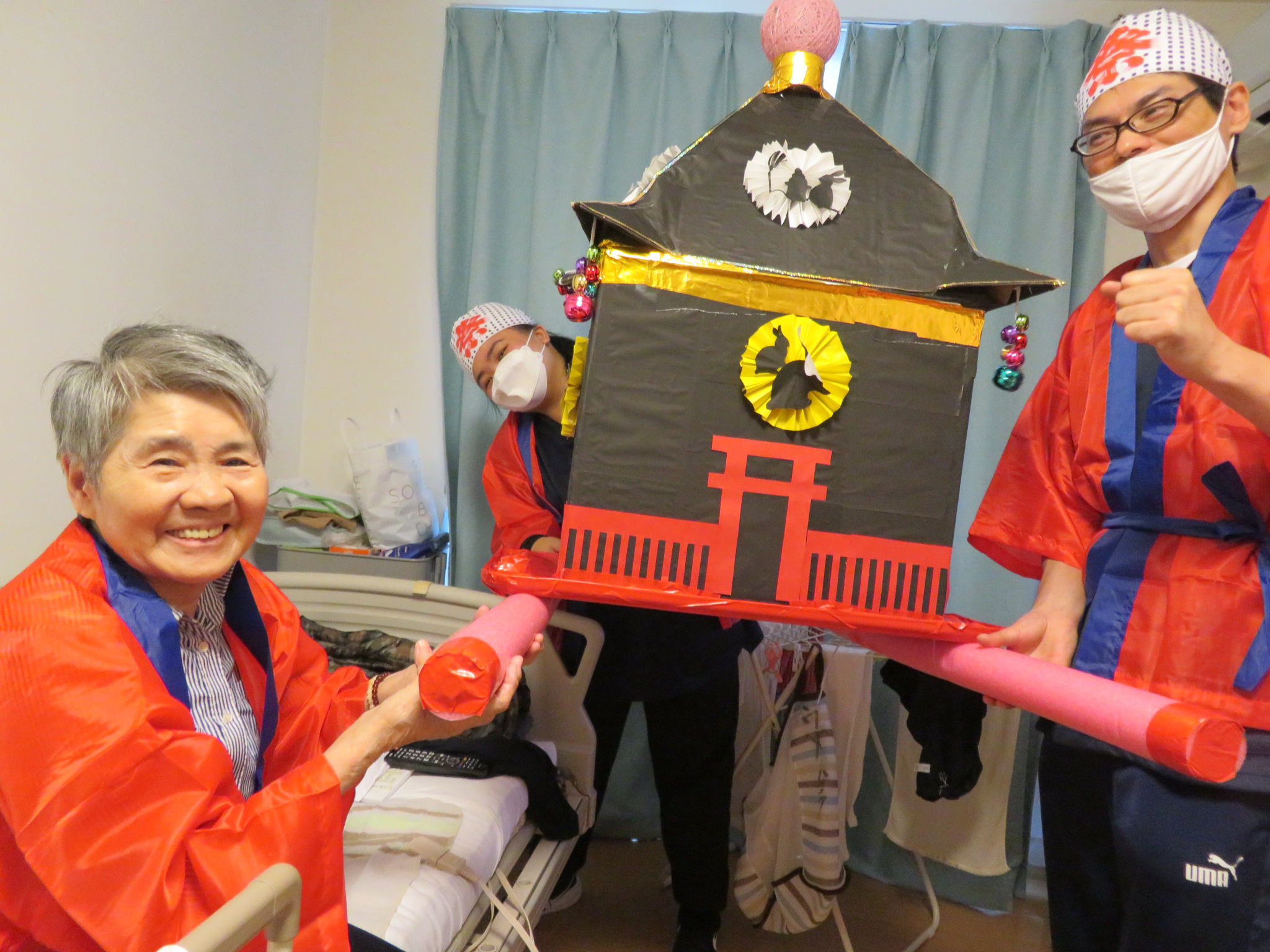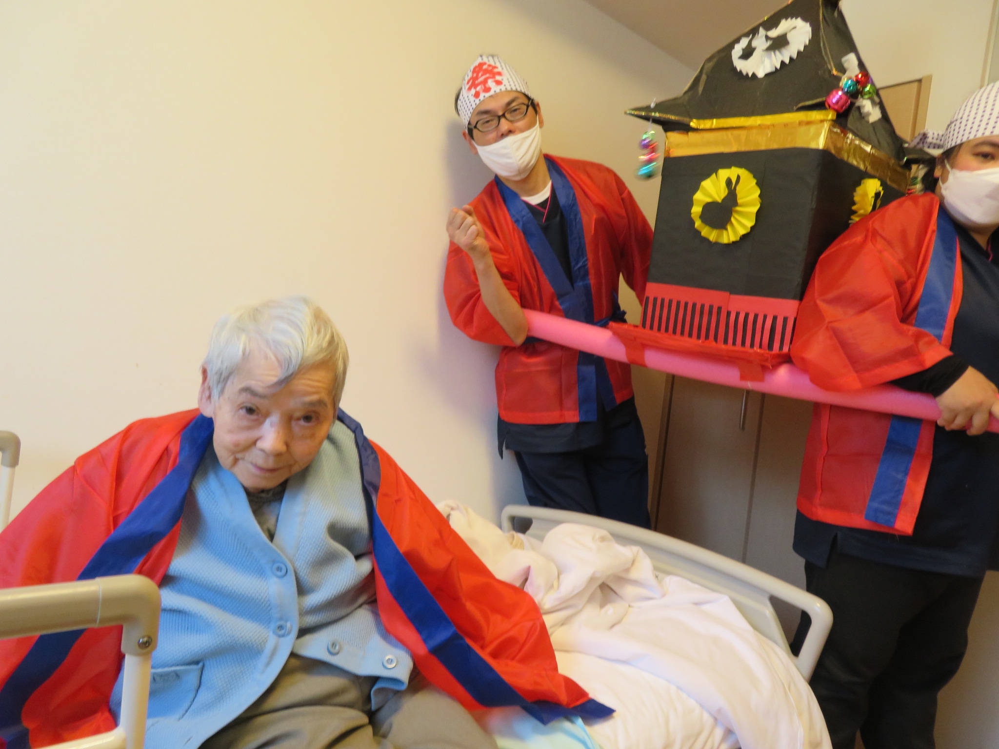 突然の音楽と掛け声に驚かれたご利用者もおられましたが、ご利用者にも法被を着て頂き、一緒に「ワッショイ・ワッショイ」と威勢の良い声と笑顔が広がりました。