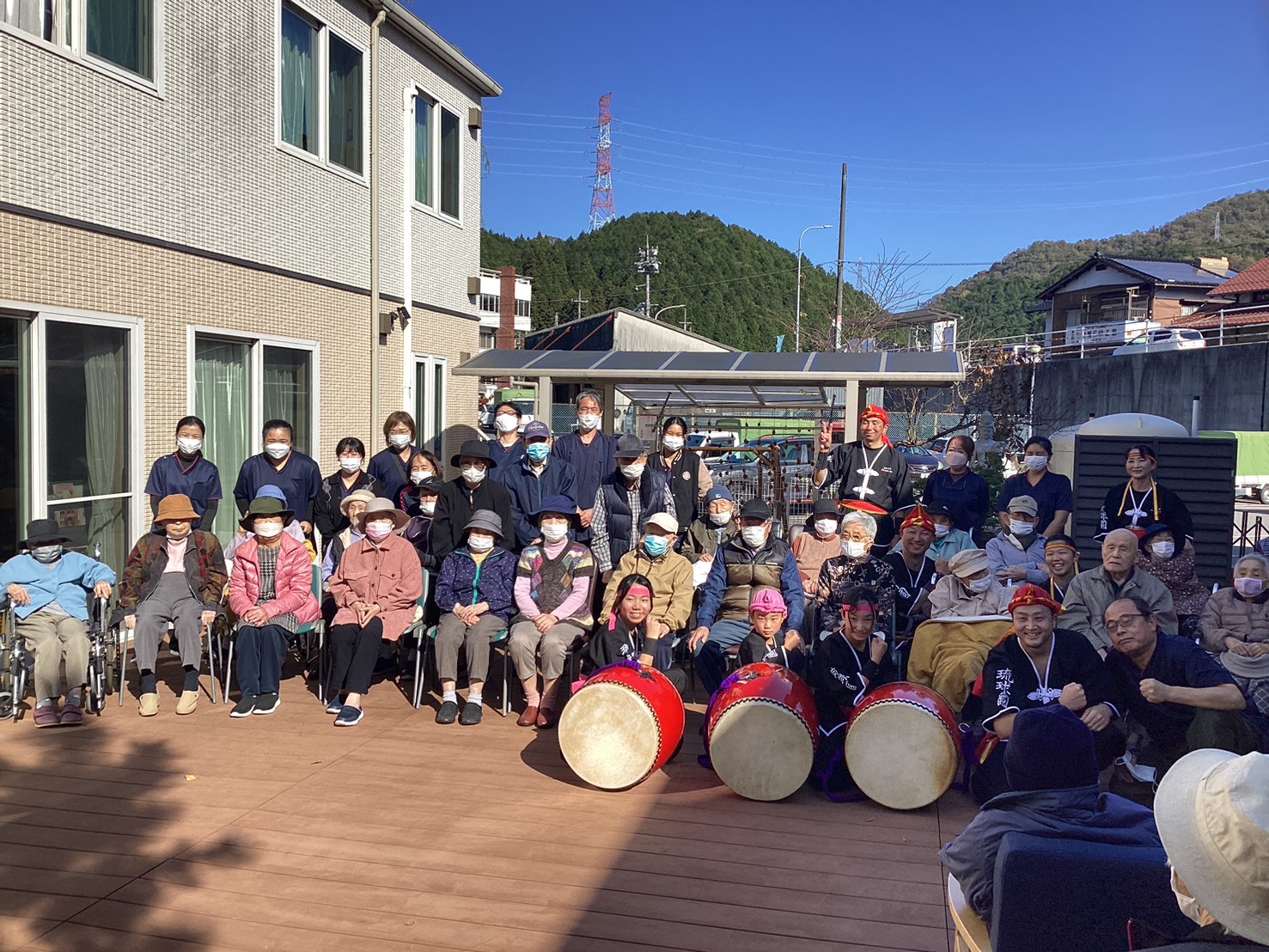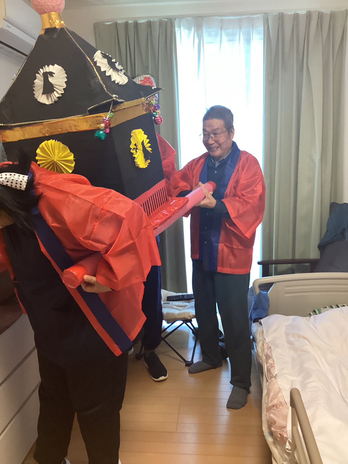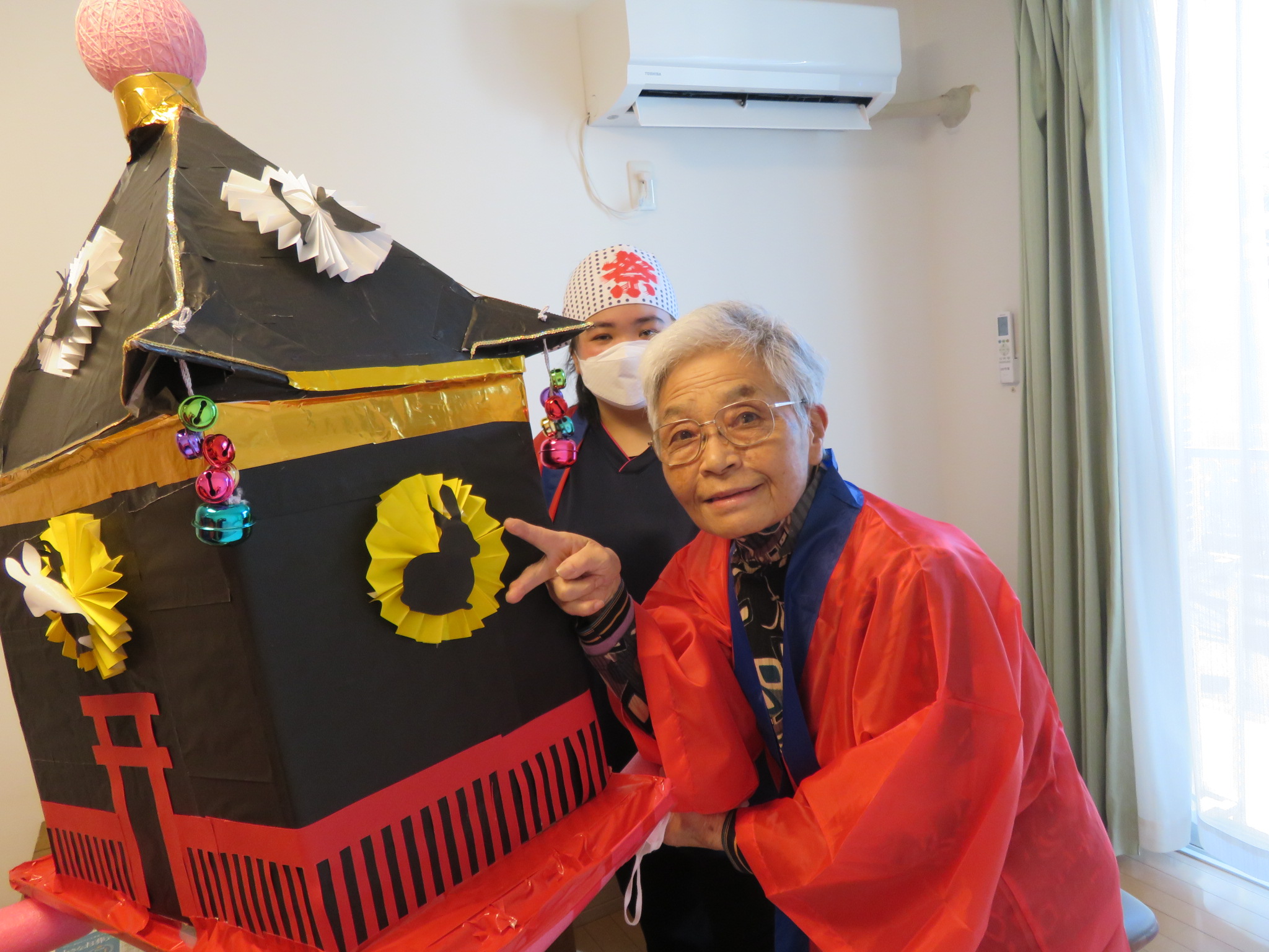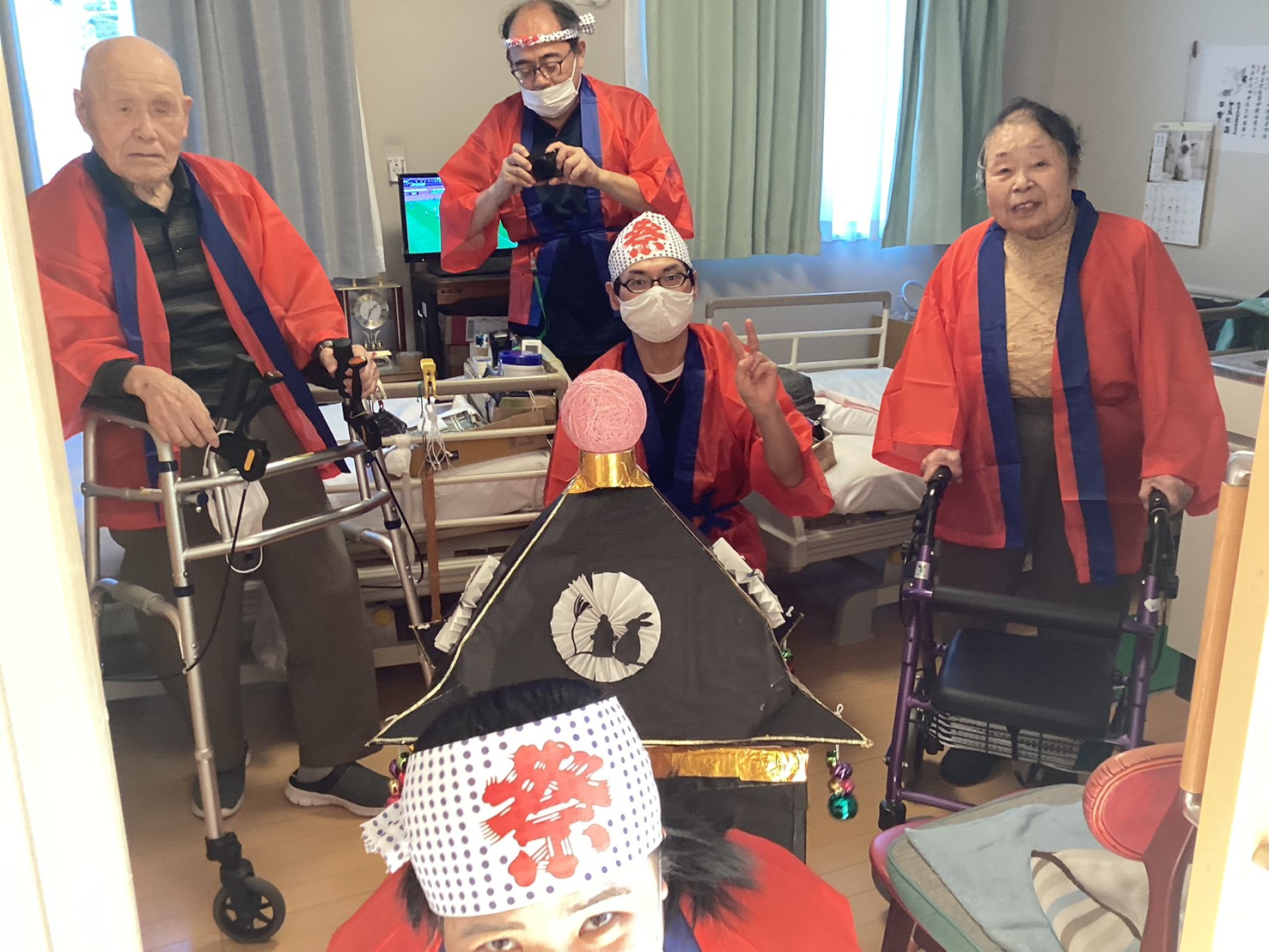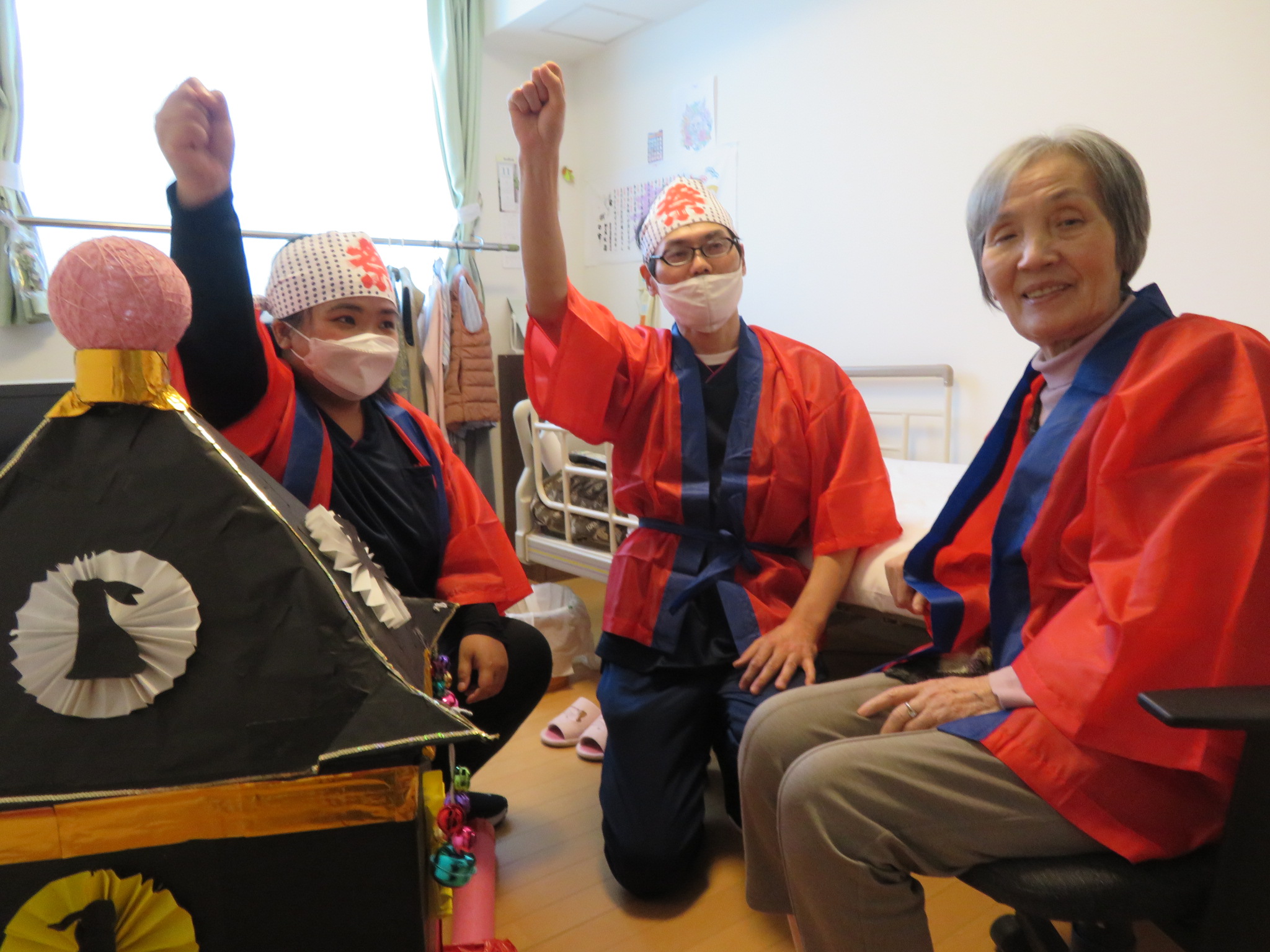 突然の音楽と掛け声に驚かれたご利用者もおられましたが、ご利用者にも法被を着て頂き、一緒に「ワッショイ・ワッショイ」と威勢の良い声と笑顔が広がりました。