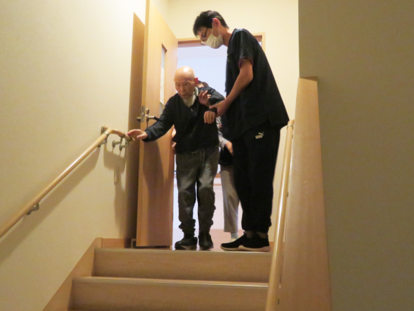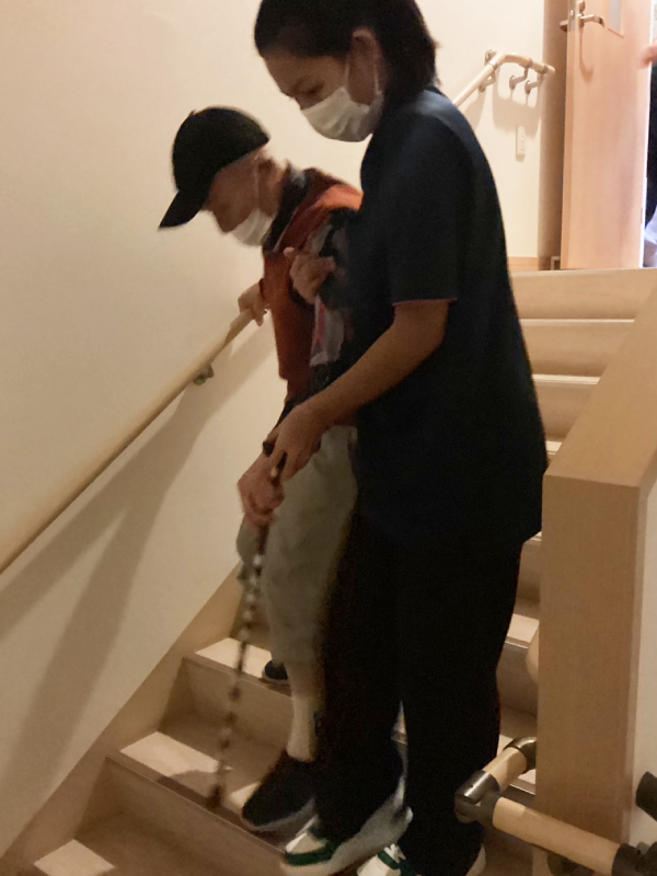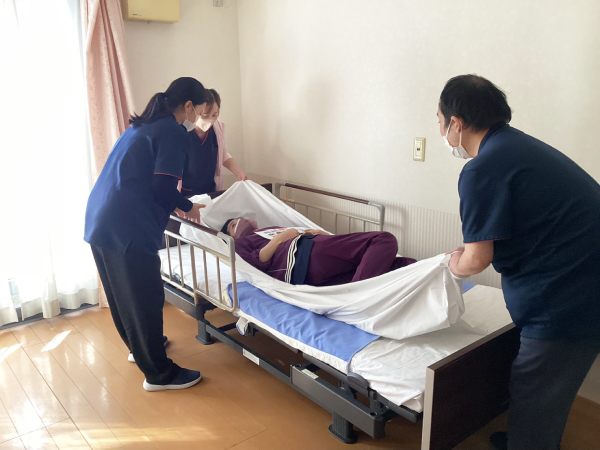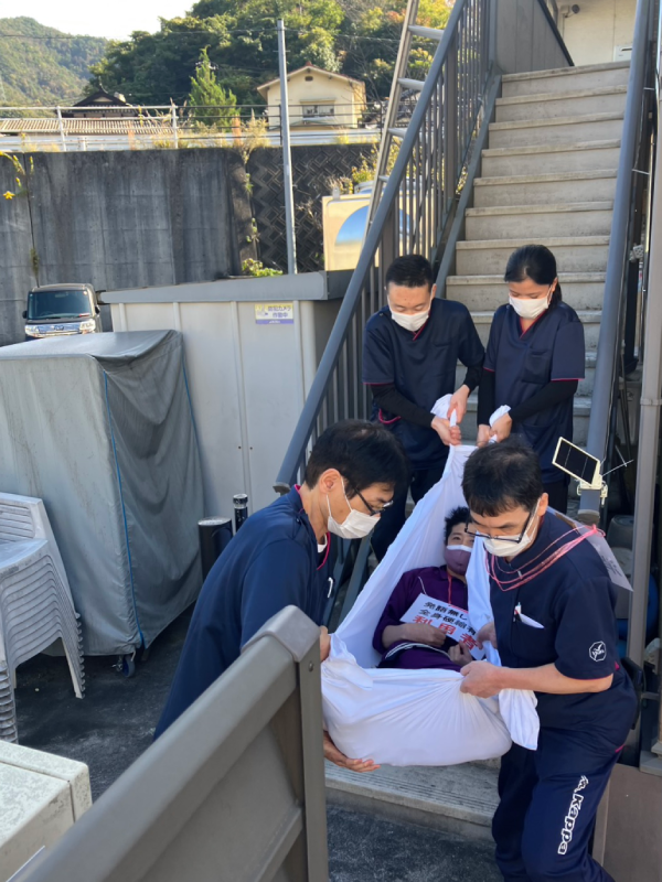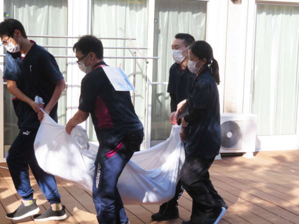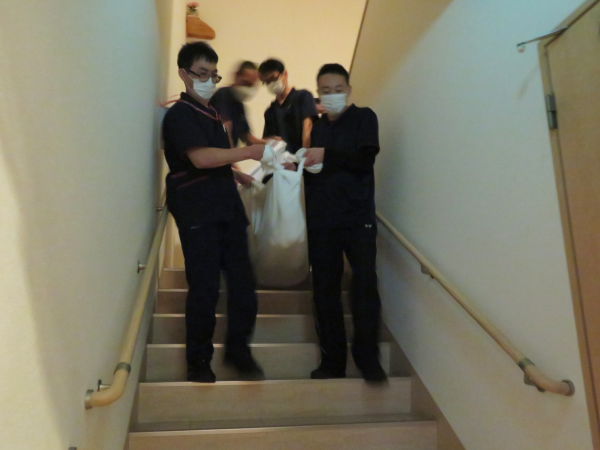 また、職員が重度のご利用者様役となり、シーツなどを用いて2階から1階へ階段で移送する訓練も行いました。
