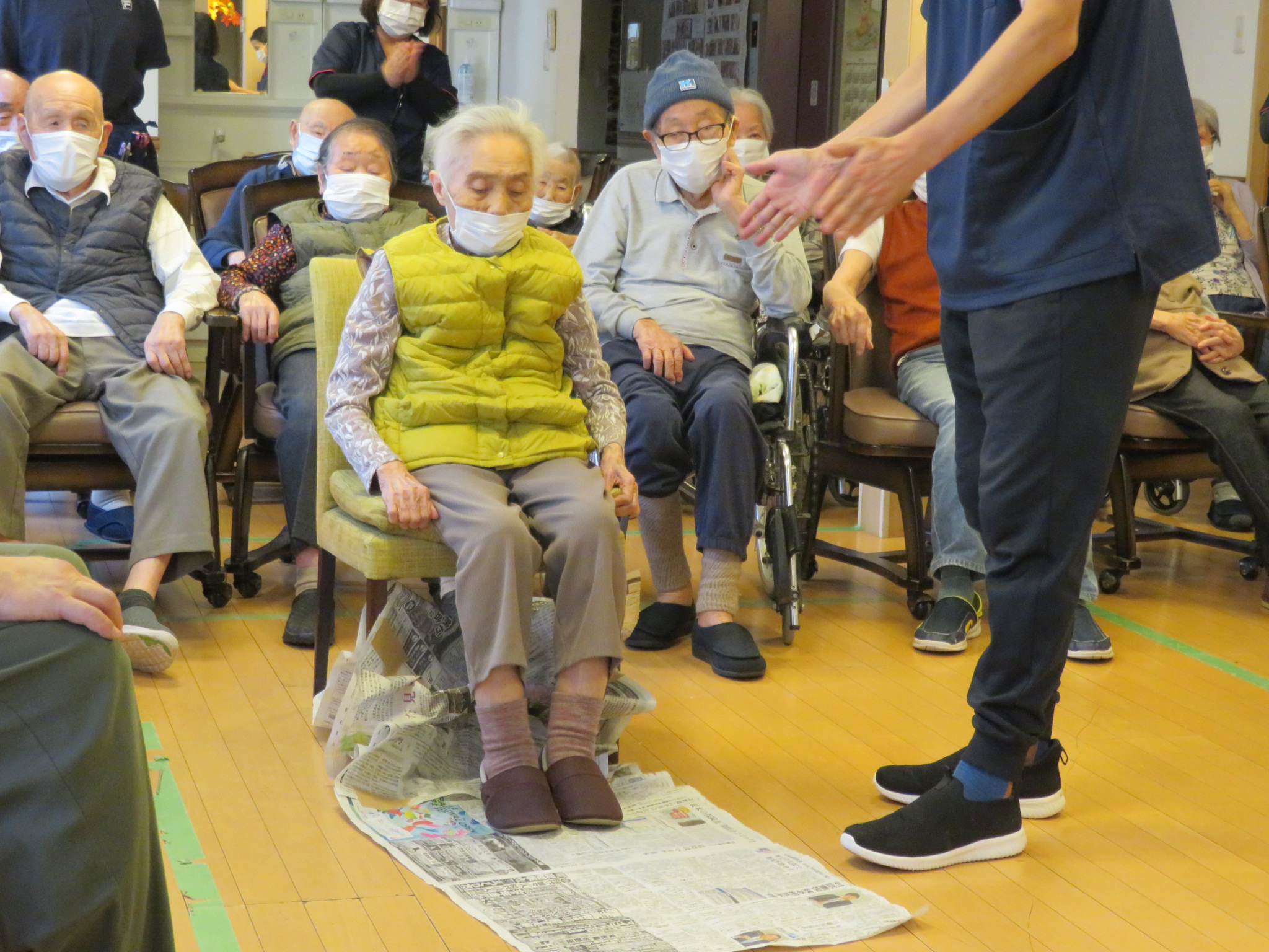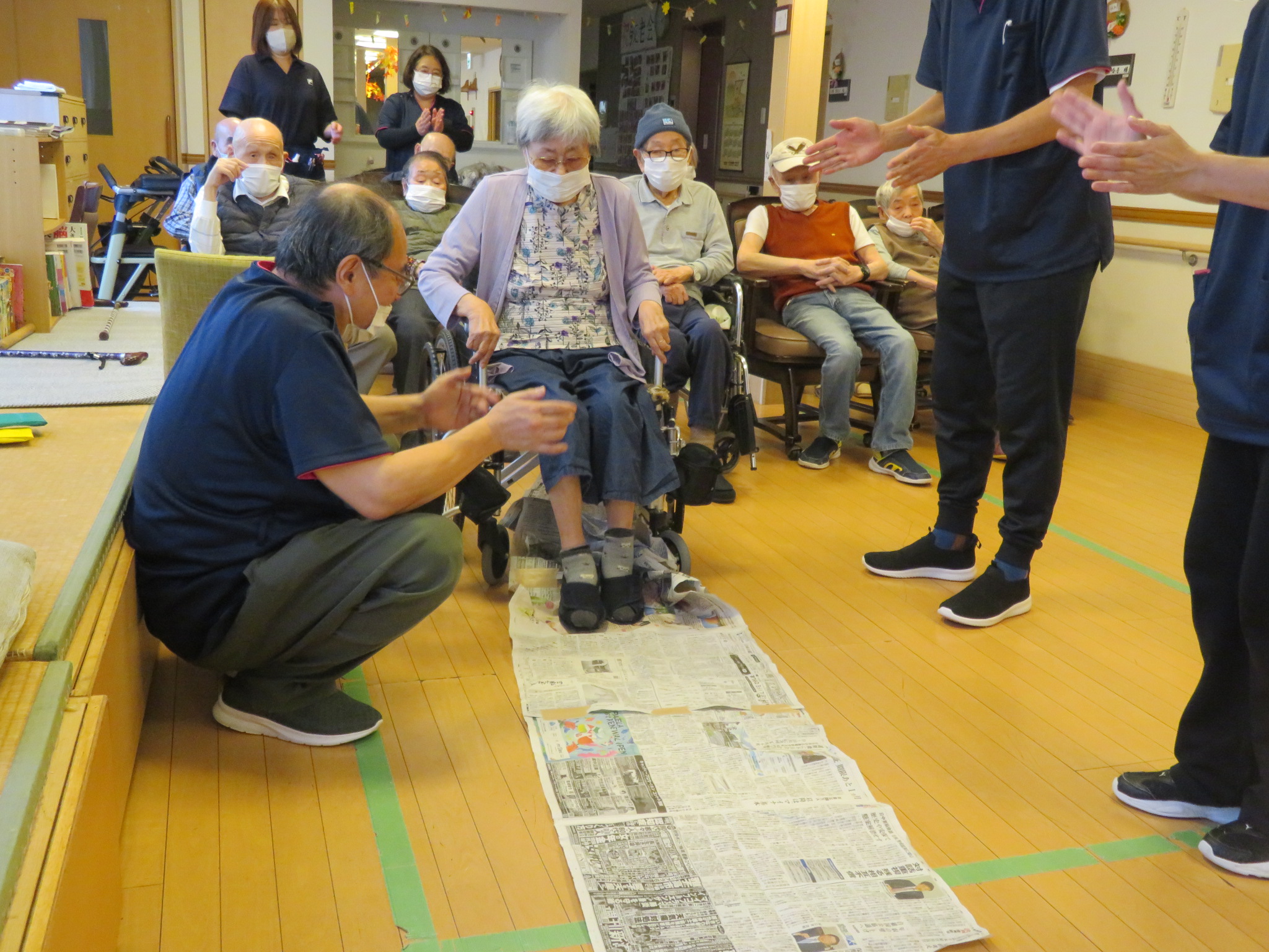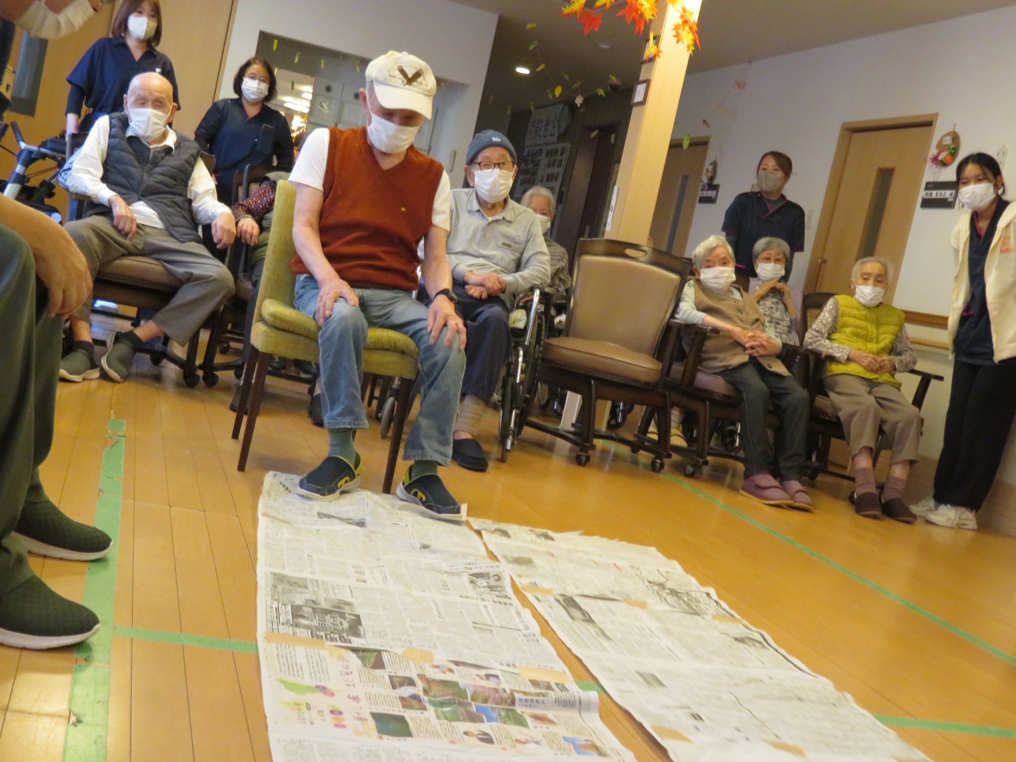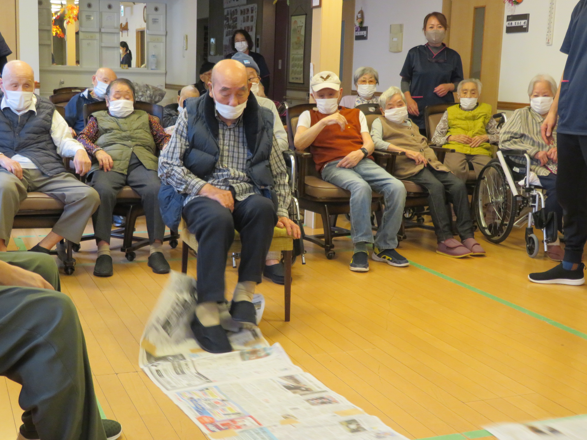 11月11日は「介護の日」です。 湯楽苑では、健康に楽しく過ごして頂きたいとの思いから、本日は運動会を実施しました。 しっかりと体操をしてから、1階チームと2階チームに分かれて対抗戦。 ボール回し、玉入れ、新聞引きを行いました。 好プレーや珍プレーと、白熱した中にも笑いもあり、あっという間に時間が過ぎました。 皆さんにとって、いい日が続きますように。