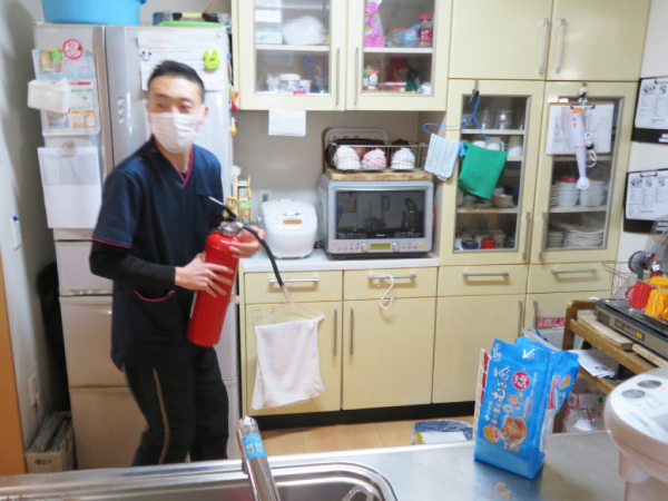 今回は日中を想定した訓練として、火災の発見から通報、初期消火、避難誘導までの一連の流れを確認しました。