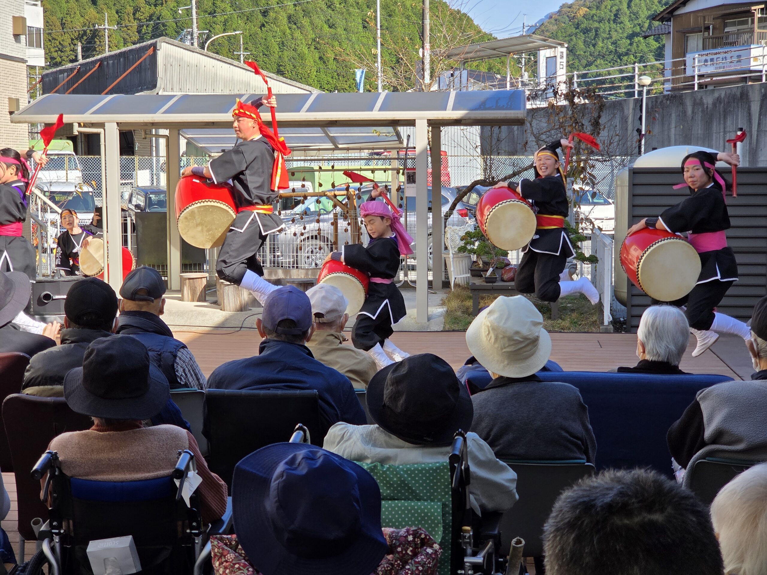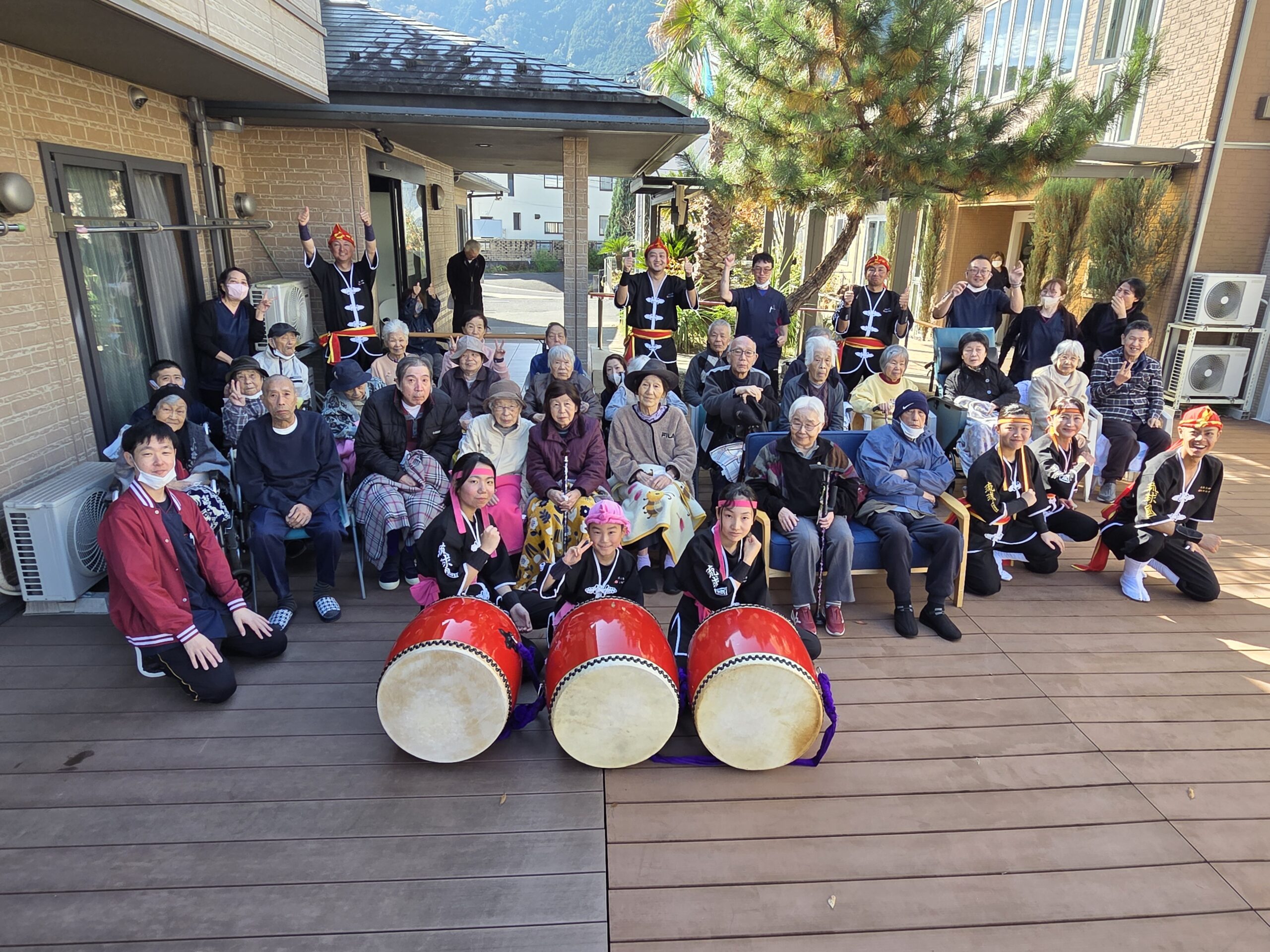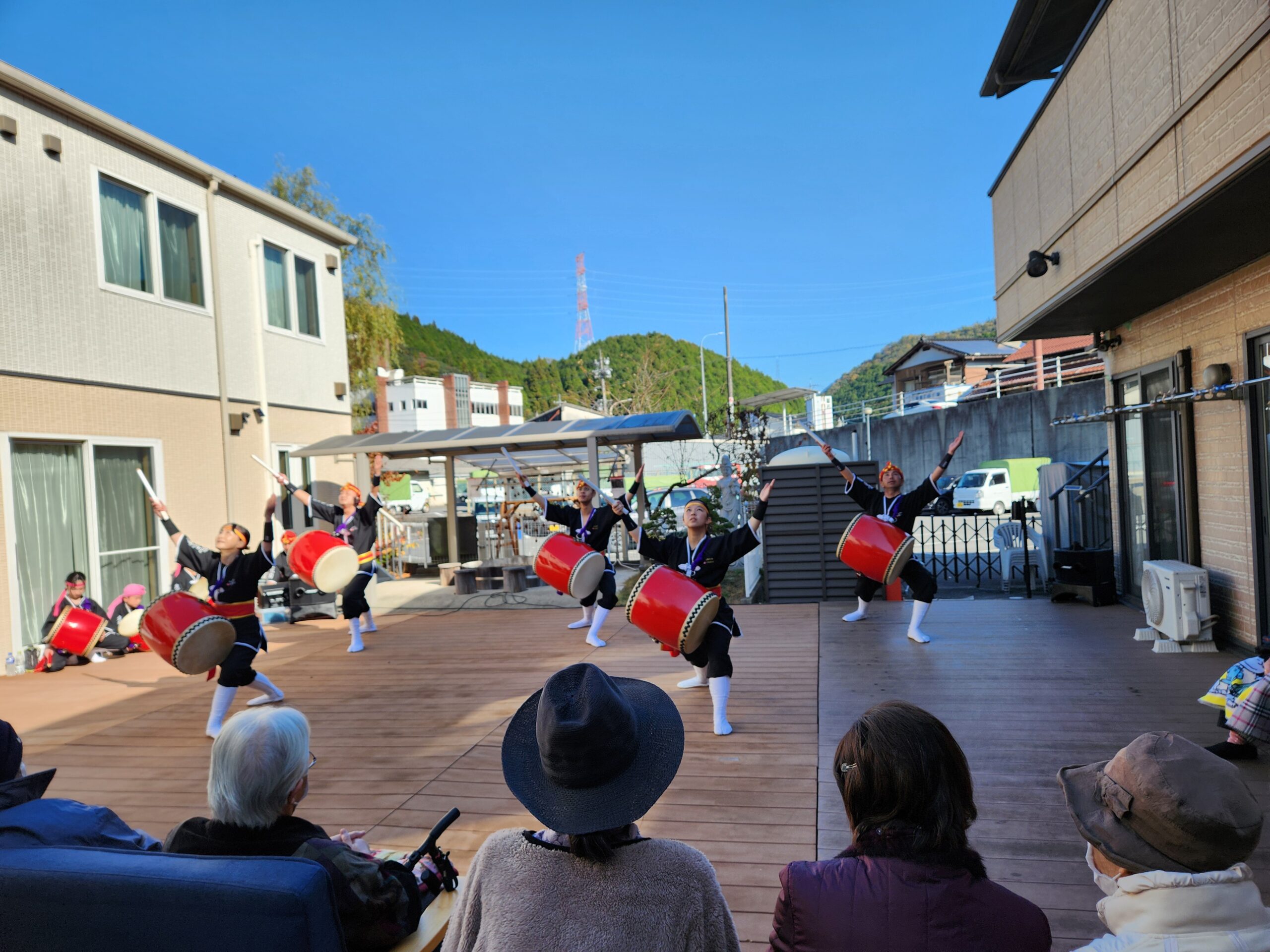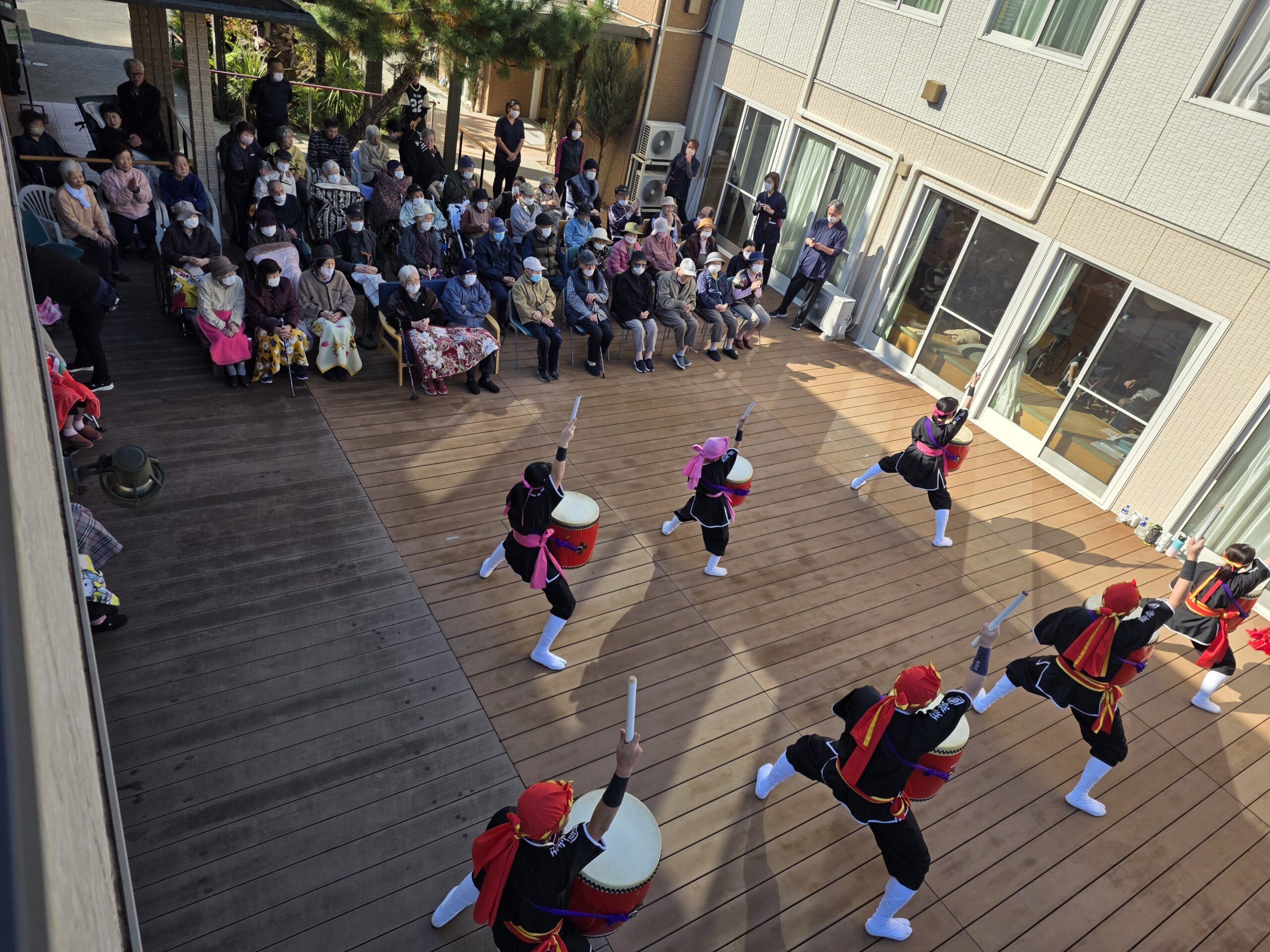 施設のウッドデッキでの観覧であり、少し寒いかな?と感じる時間帯でしたが、演者の皆様のおかげでエイサーの力により、体がポカポカになりました。