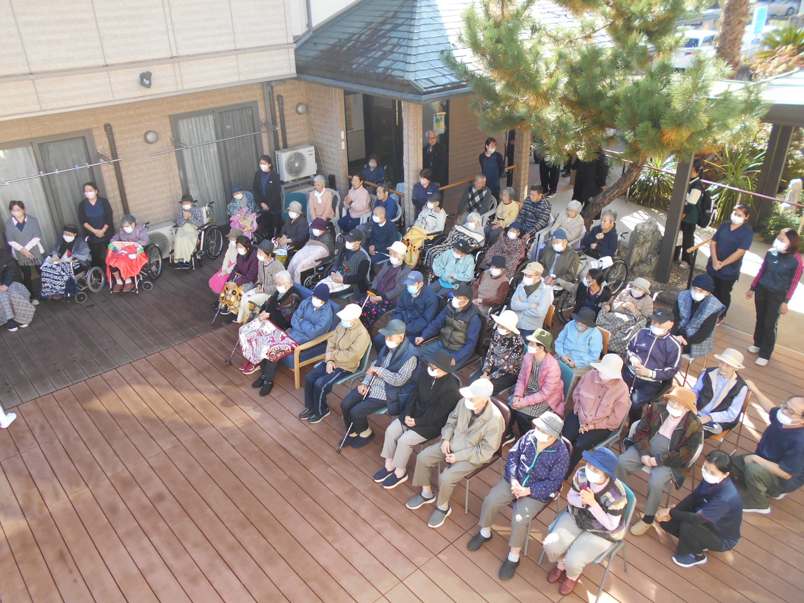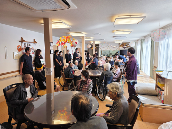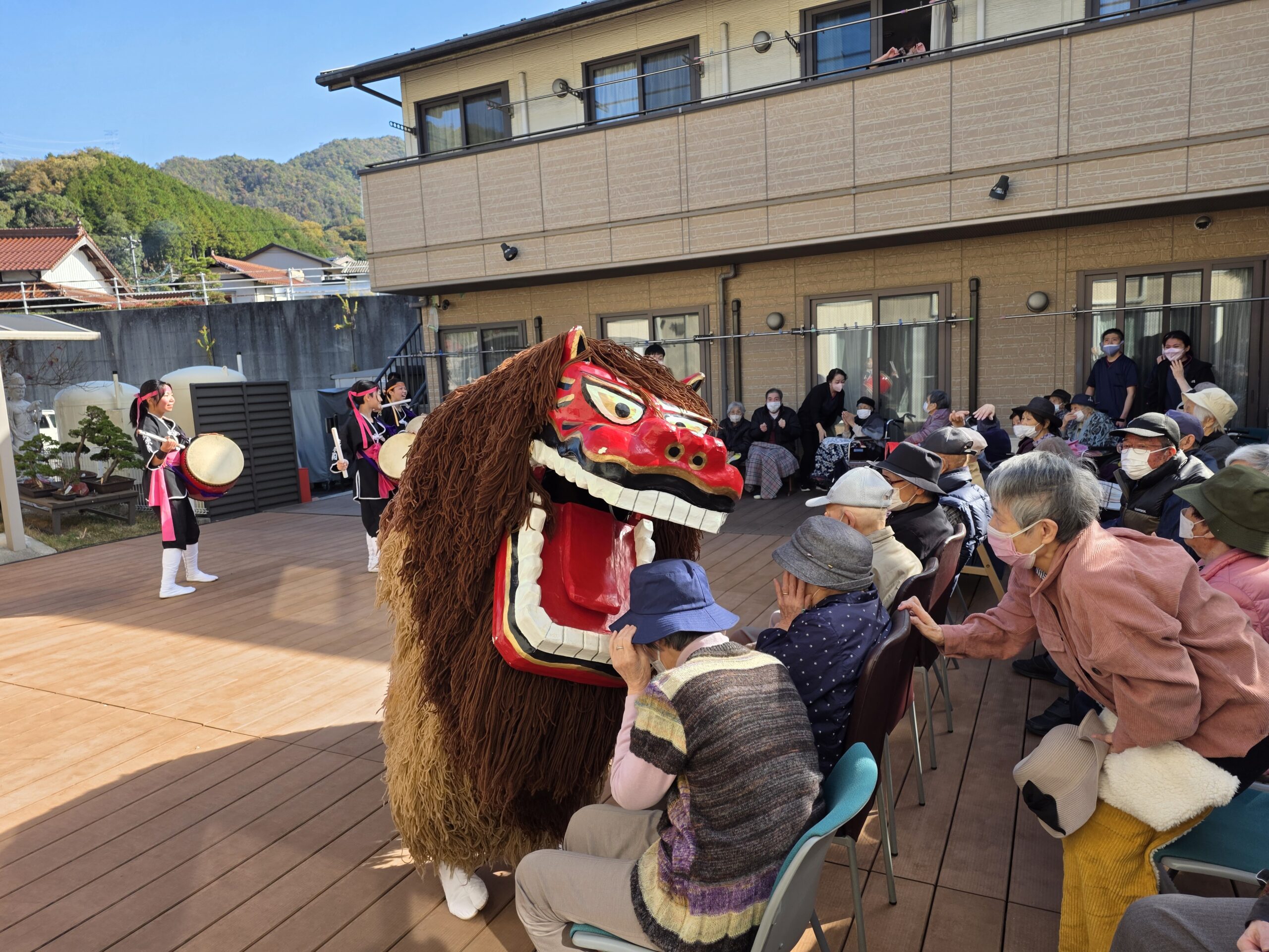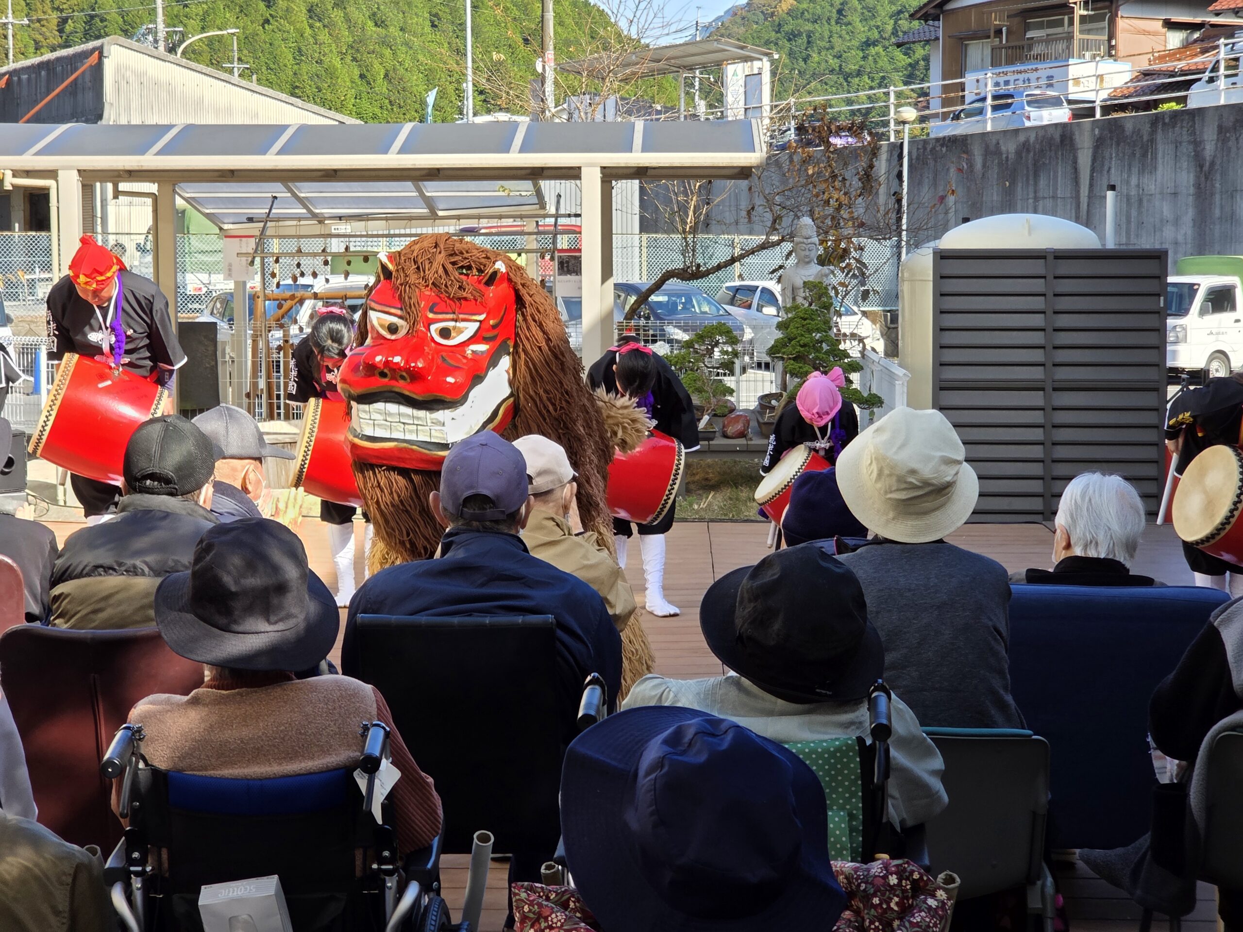 施設のウッドデッキでの観覧であり、少し寒いかな?と感じる時間帯でしたが、演者の皆様のおかげでエイサーの力により、体がポカポカになりました。