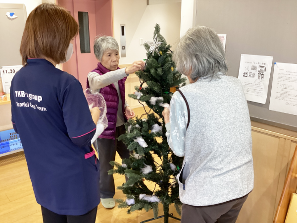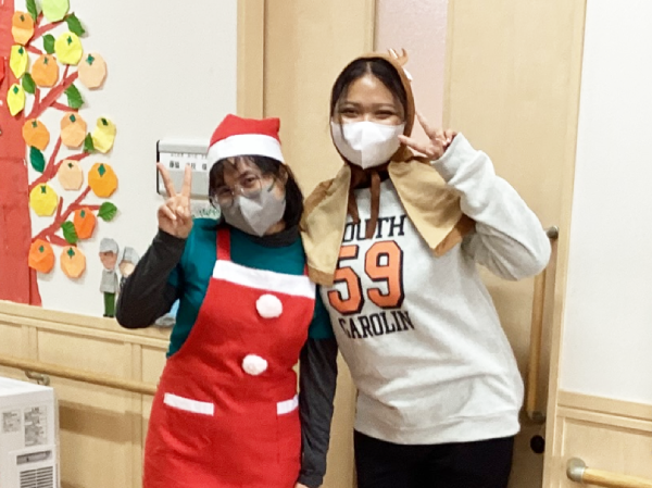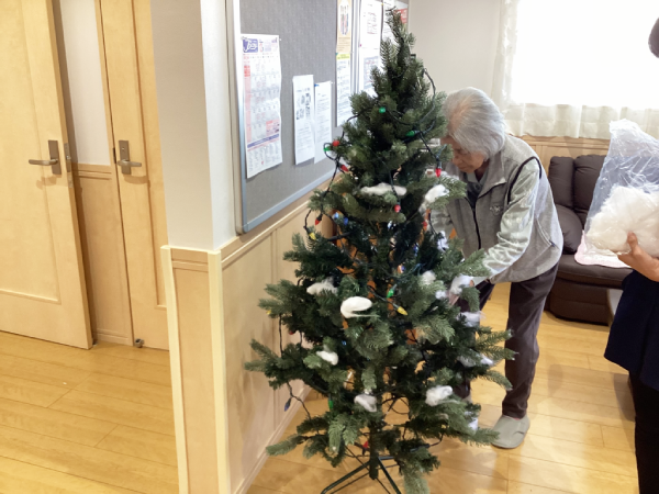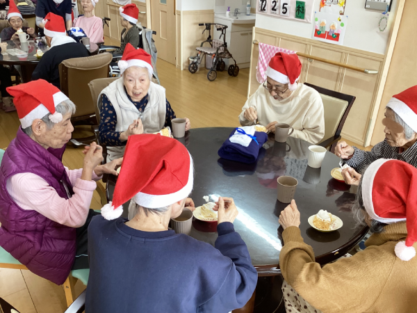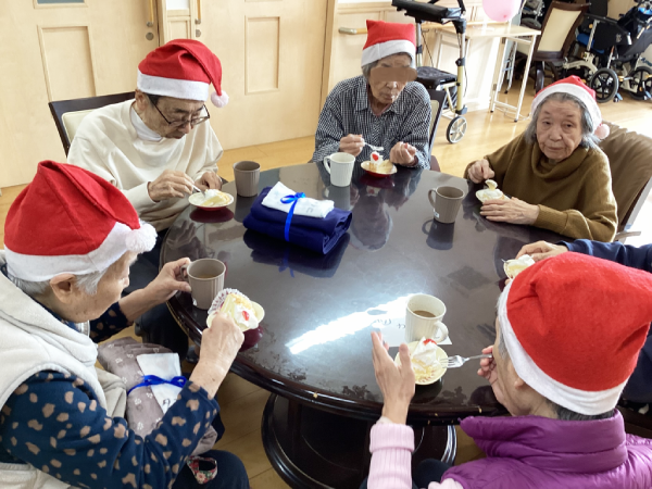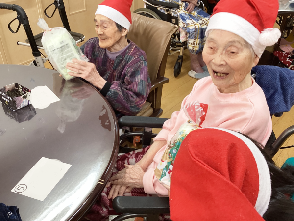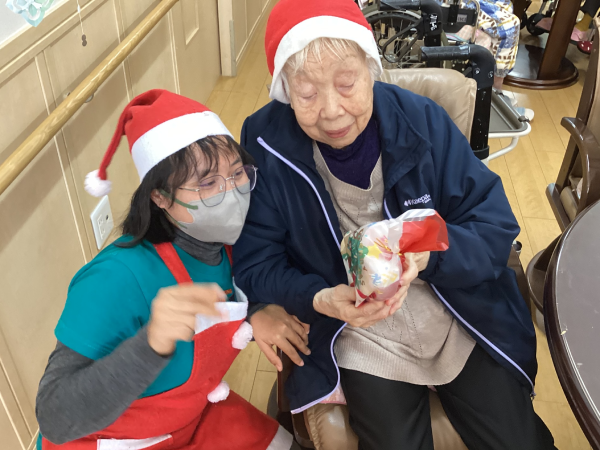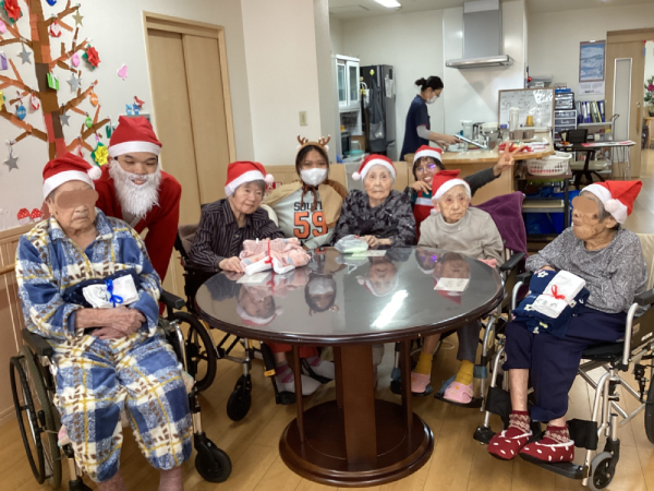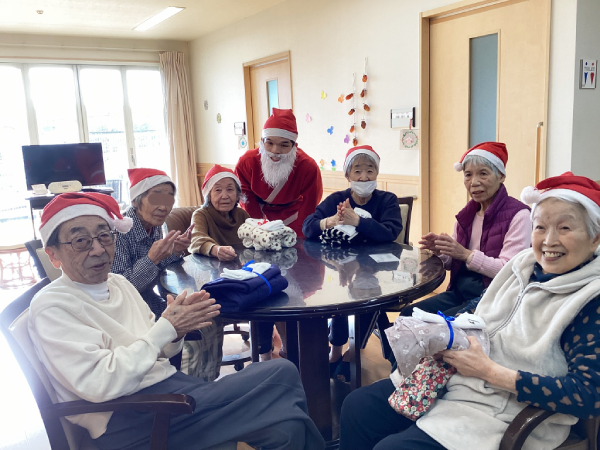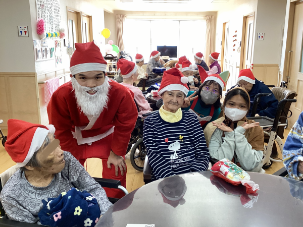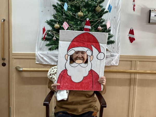 2025年の振り返り第二弾は、12月に開催したクリスマス会の様子です。 クリスマス前から、ご利用者の皆さまの力をお借りし、クリスマスツリーの飾り付けを行いました。 クリスマス当日には、白いひげをたくわえたサンタクロースが来苑! エプロン姿のサンタ助手と一緒に、プレゼントを持ってご利用者の皆さまのもとを回りました。 ご利用者の皆さまもサンタ帽子をかぶって気分を高められ、顔出しパネルを使ってサンタクロースになりきり、記念撮影を楽しまれました。