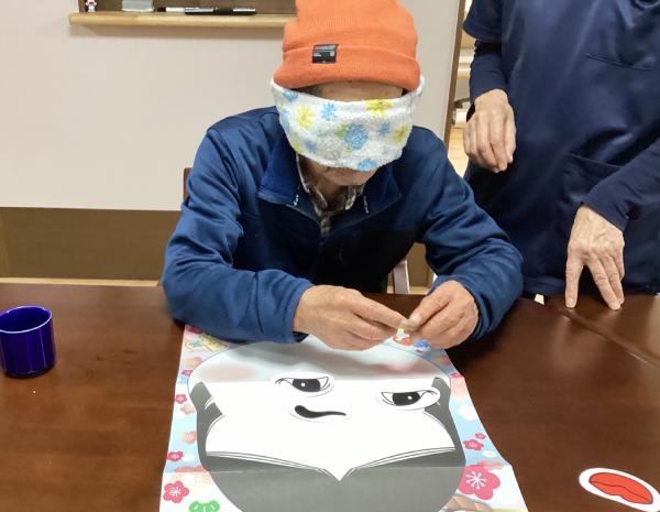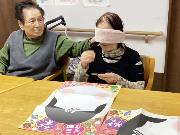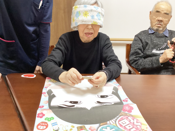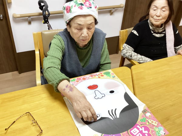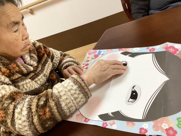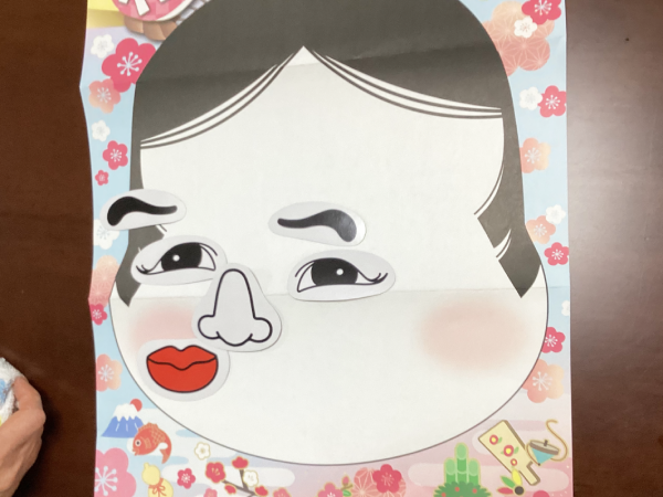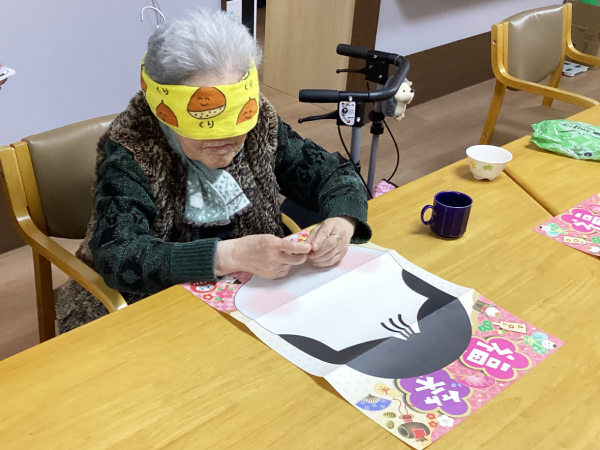 グループホーム安佐物語ご利用者様の、お正月のご様子をお届けします。 第四弾は、福笑いです(^_-)-☆ おたふくの福笑い。 目隠しをした状態で輪郭を確かめ、思うところへ「バチッ!」と配置すると・・・ まるでピカソの絵画のような、おたふくに仕上がりました。