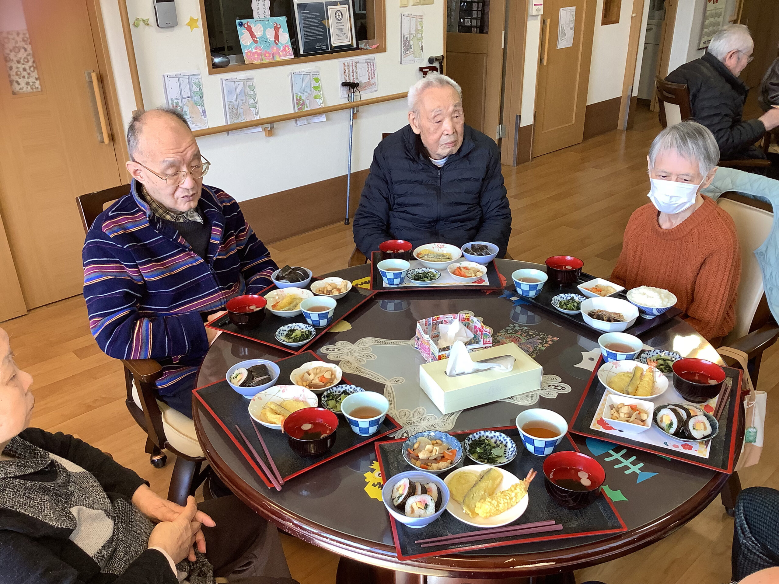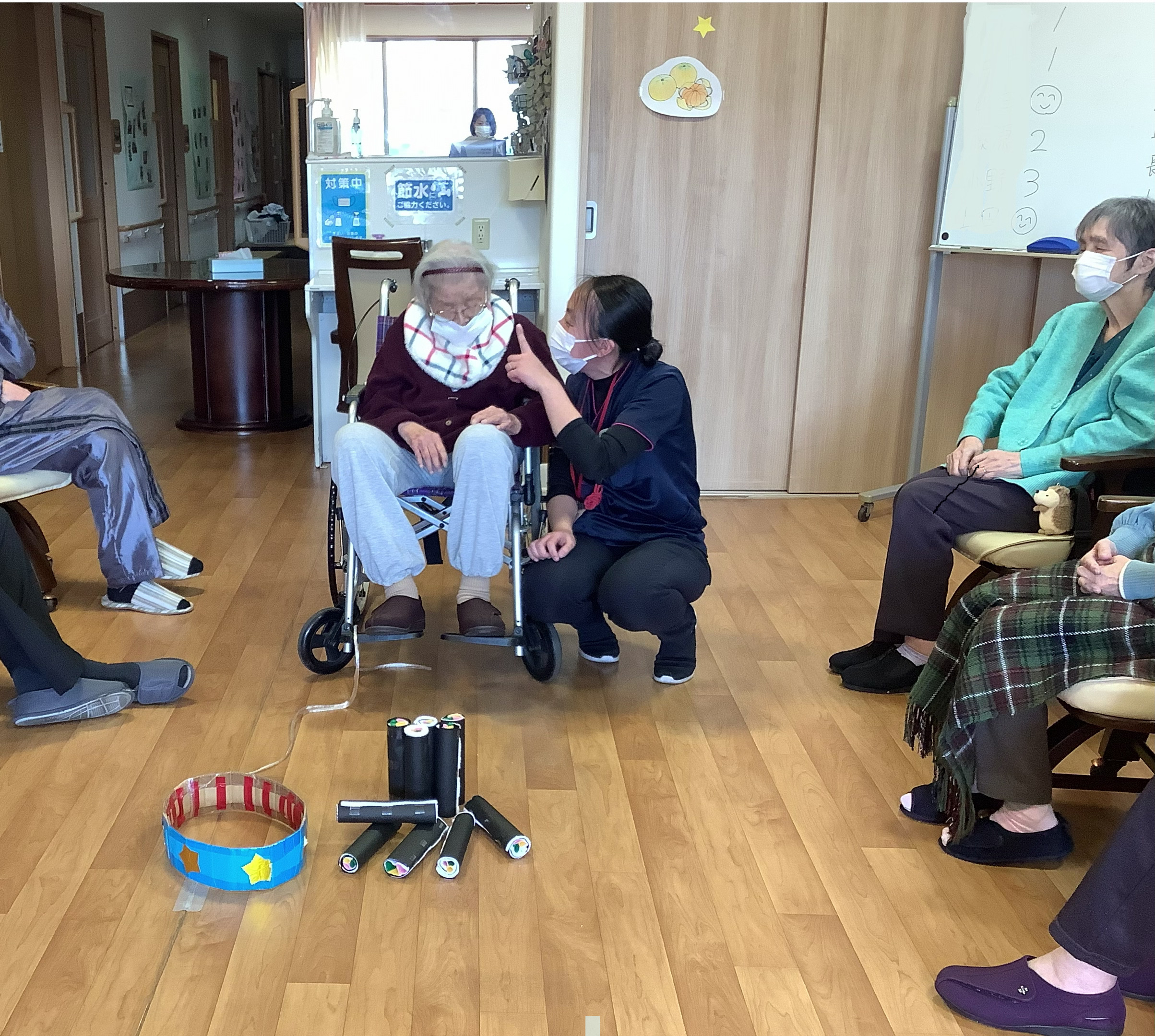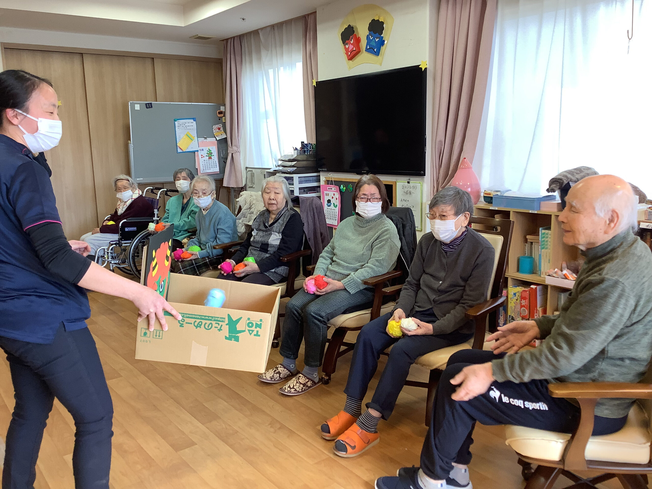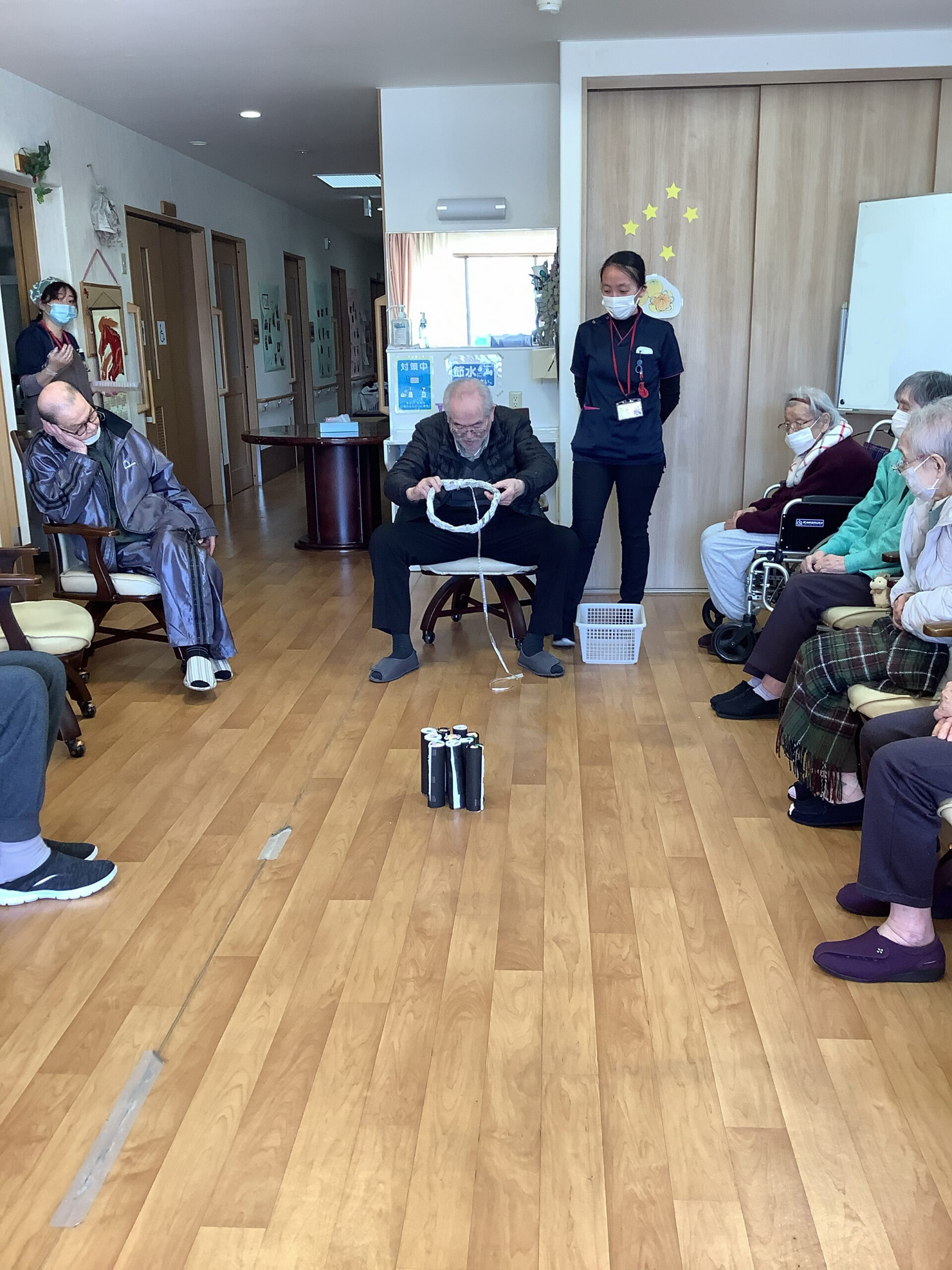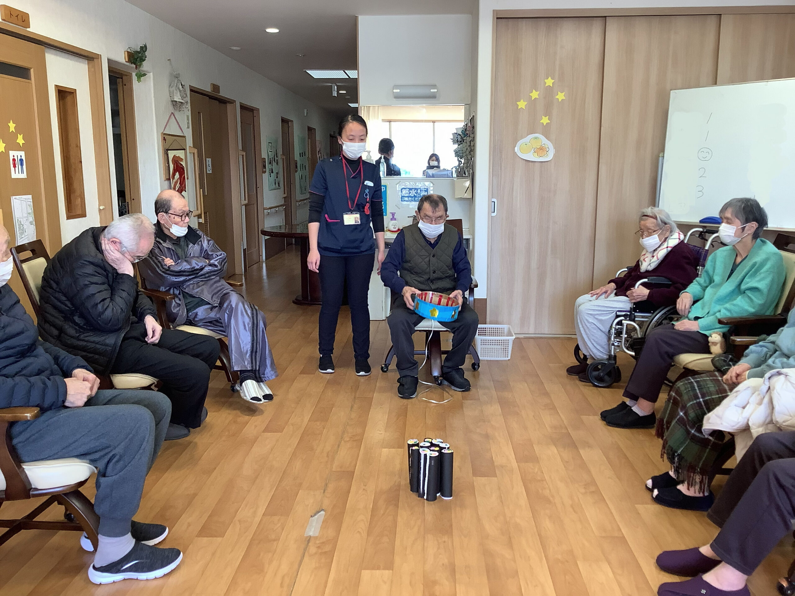 楽々苑では節分にちなんで巻きずしを引き寄せるゲームをしました♪ なかなか思うようにいかず、成功者も現れない… 「こりゃだめだ」と誰もが思ったとき! 女性のご利用者様がなんと10本すべての巻きずしを引き寄せられ その場にいた全員がびっくり( ゚Д゚) 一番の盛り上がりとなりました。 そしてゲームのあとは、しっかり本物の巻きずしを楽しまれました♪