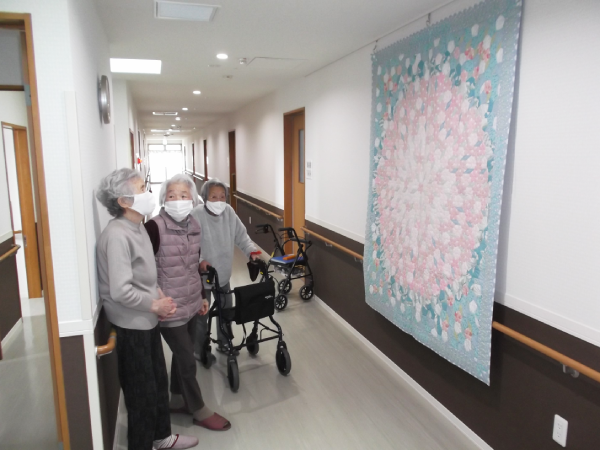 間もなく春です。大型キルトがさくら模様に変わりました(^^♪ 桜の季節が、すぐそこまで近づいてきました。 吉田楽々苑では、廊下を彩る大型キルトが冬模様から春の「さくら模様」へと交換されました。 このキルトは、施設職員が趣味として取り組んで制作しているものです。 近くで見ると、桜の花がびっしりと丁寧に縫い込まれており、その細やかな仕上がりには思わず見入ってしまいます。 入居者の皆さんも、このさくら模様を毎年楽しみにされており、キルトを眺めながら「もう春ですね」と、季節の訪れを感じておられる様子でした。廊下を歩くたびに、ひと足早い春を感じられる吉田楽々苑です