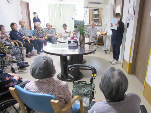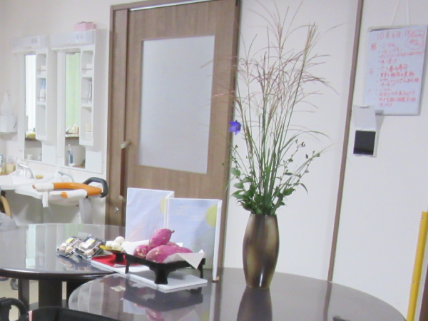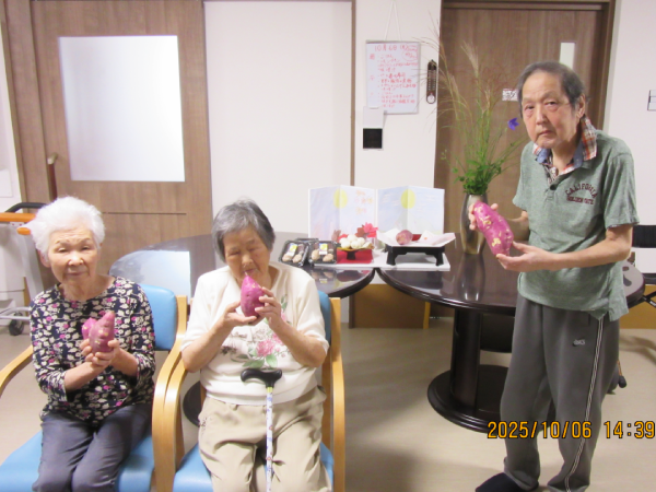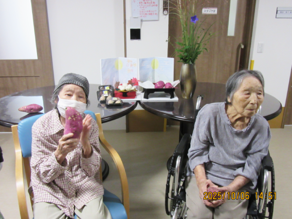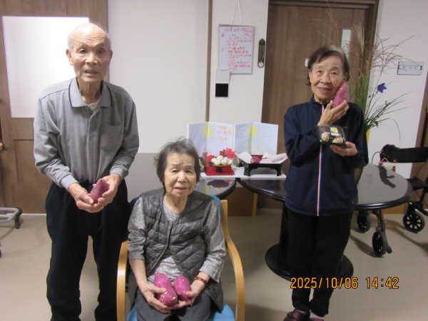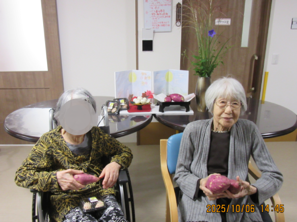 平安時代から始まったとされる「お月見」の行事を、1階・2階の利用者様と一緒に行いました。 「お月見」は、綺麗な月を眺めながら楽しむだけでなく、豊作を祈り、収穫への感謝を込めて穀物をお供えする風習とされています。 当日は、畑で採れたさつまいもをお供えし、職員が描いた満月を眺めながら、おやつを召し上がっていただきました。いつもとはひと味違う、穏やかなひとときを過ごしていただけたことと思います。