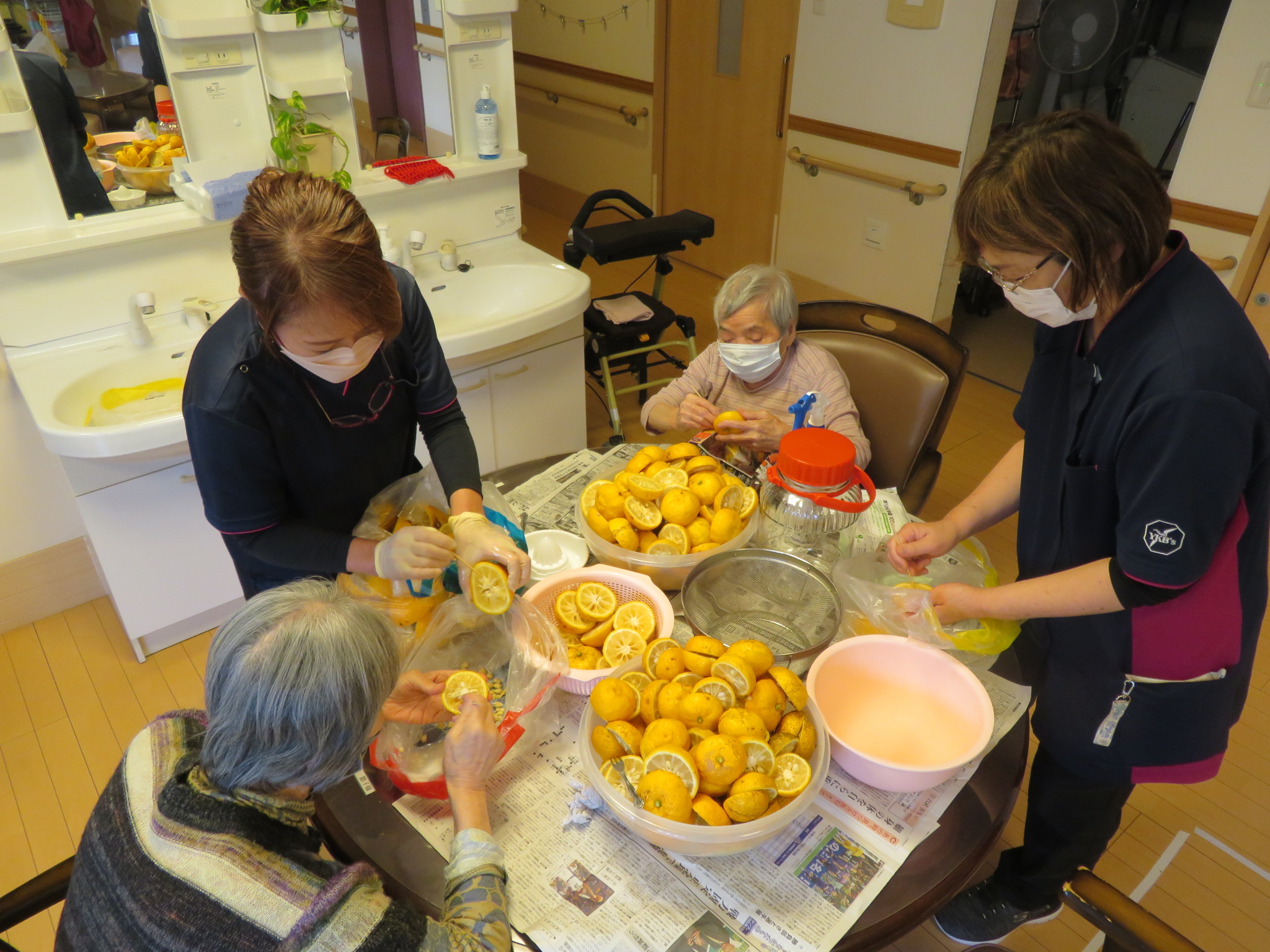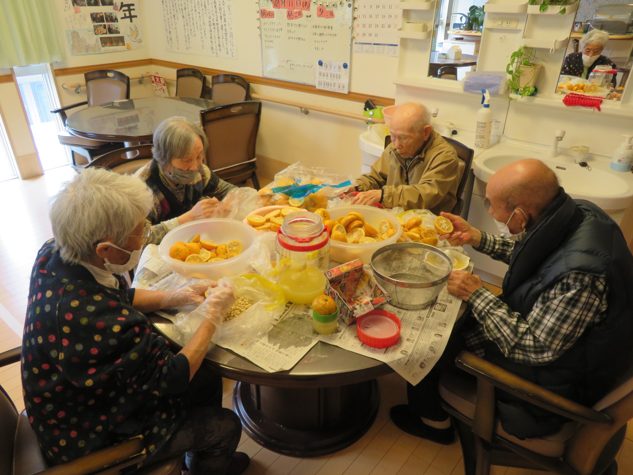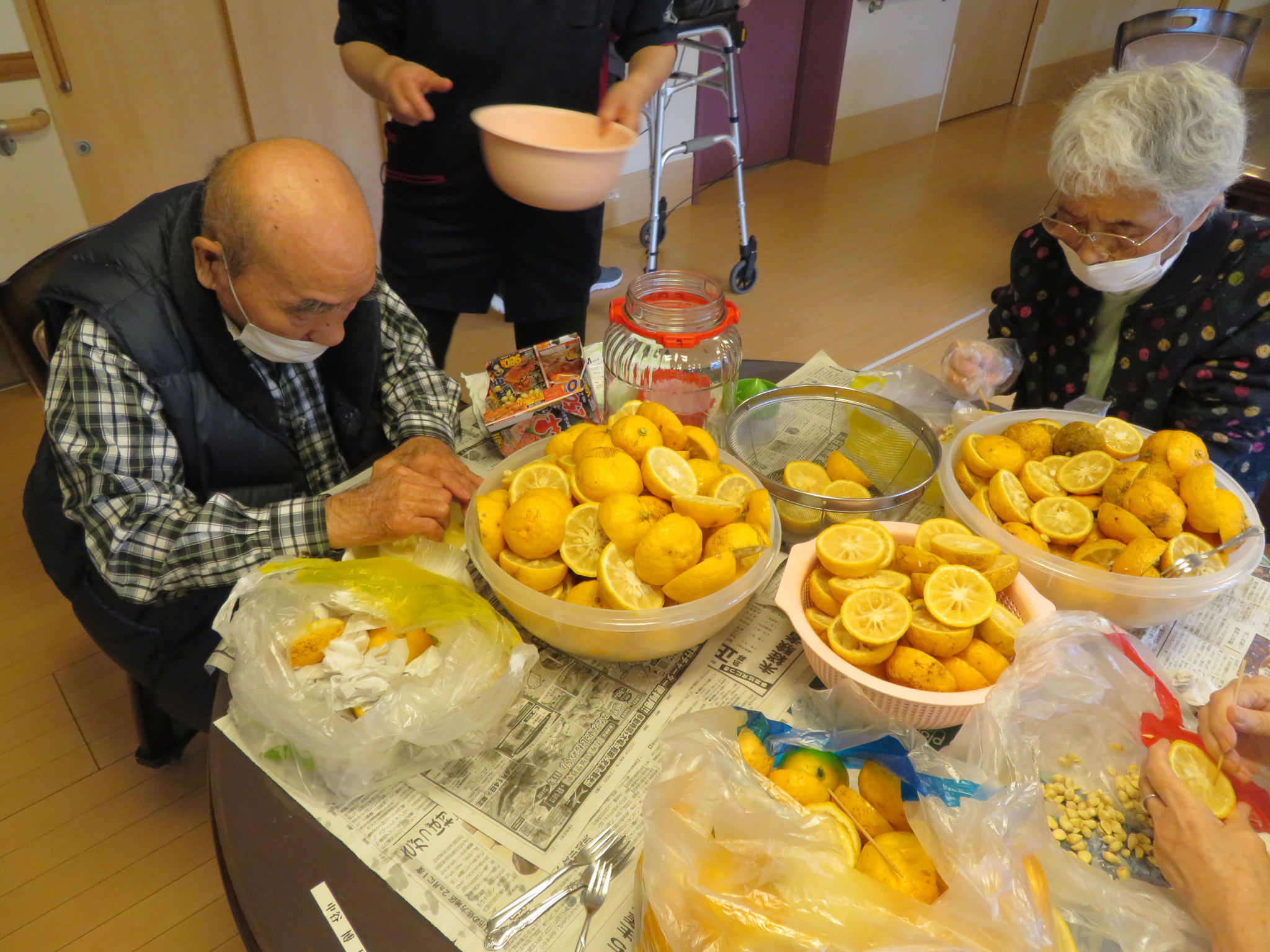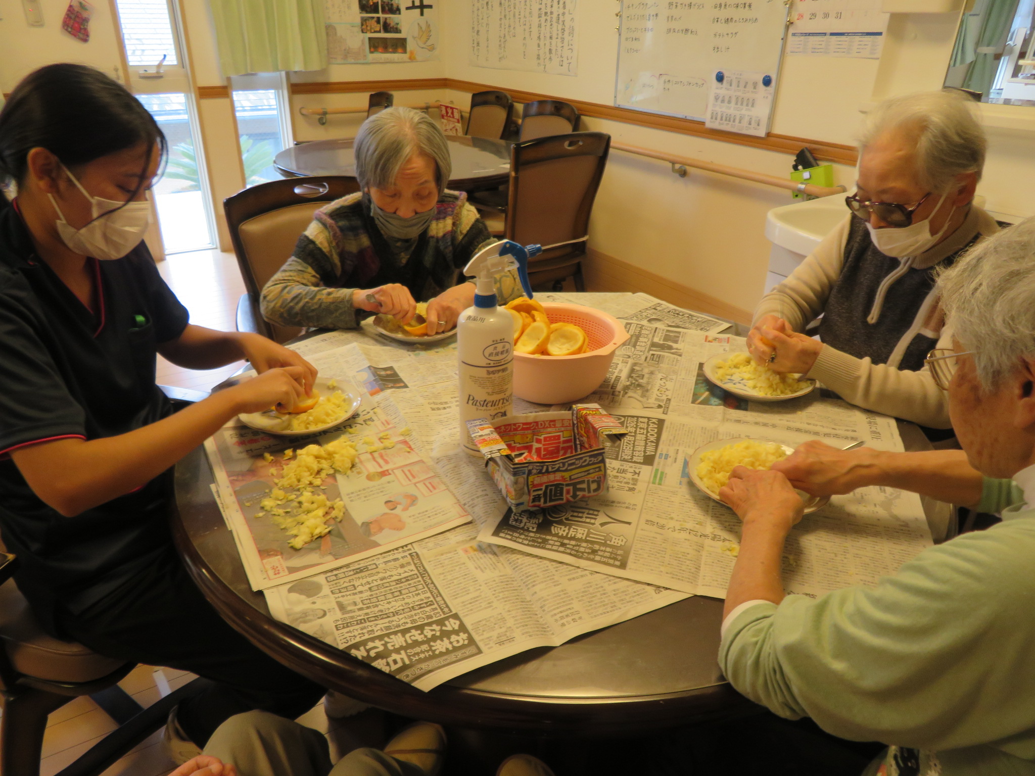 少々疲れましたが、ゆずの良い香りがホールに広がり、「良い香りがするね。美味しそうじゃね。元気が出るね。」とご利用者の方も一生懸命手伝って下さいました。